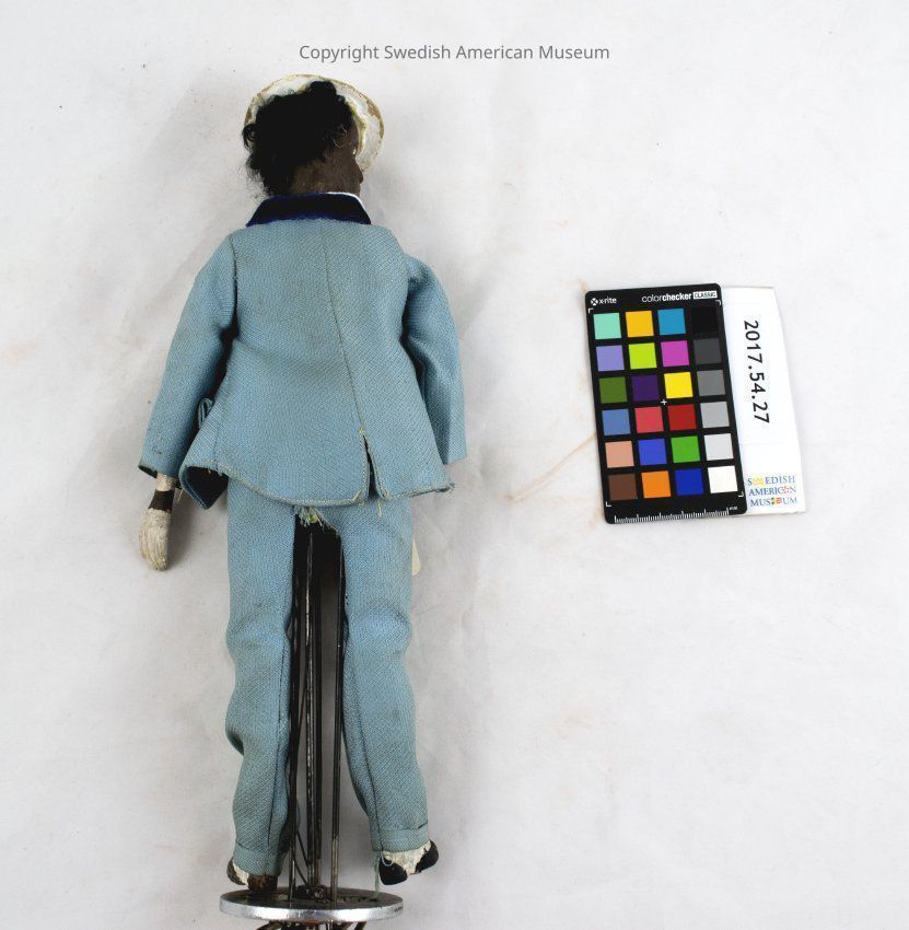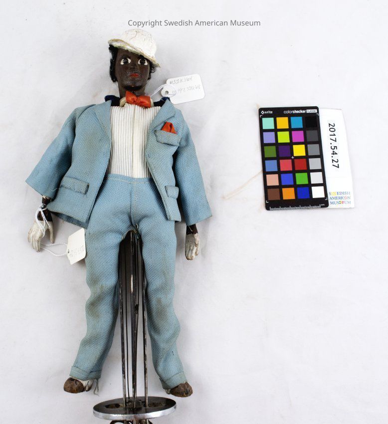 Kungsholm Miniature Grand Opera puppet. Male, standing puppet with powder blue suit, red bowtie and pocket handkerchief, white shirt, white papier-mâché bowler hat, painted white gloves, and blue velvet collar.Context