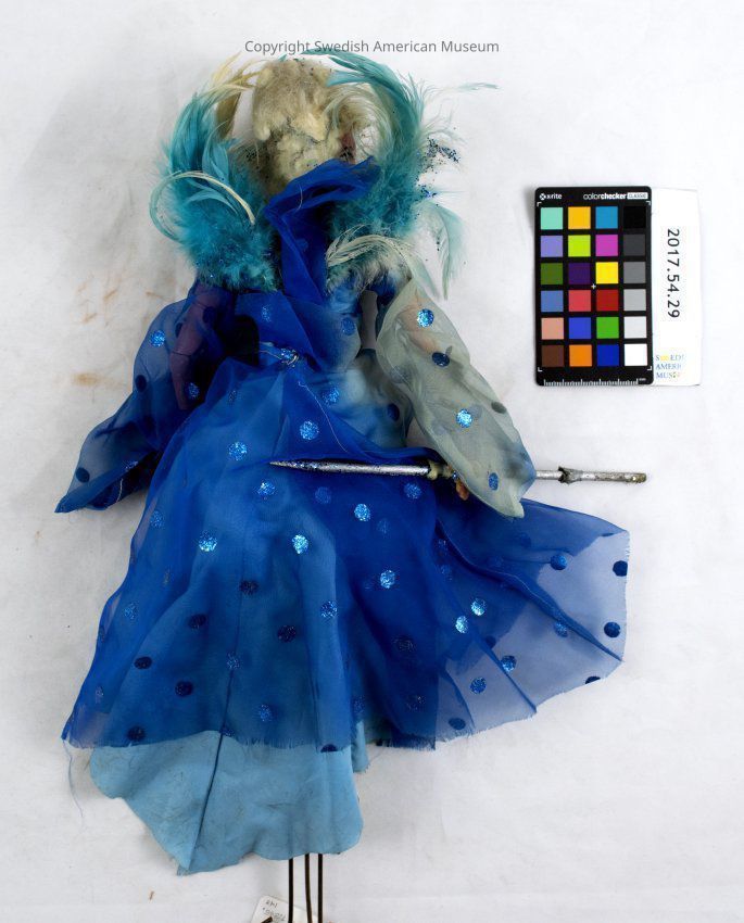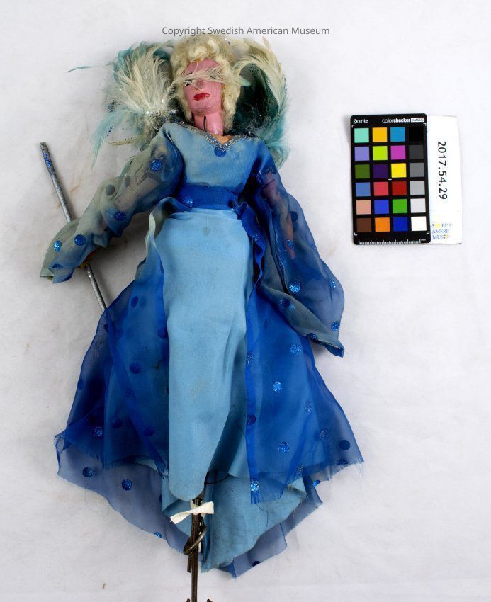 Kungsholm Miniature Grand Opera puppet. Female puppet with blue and white feathers, long stick of silver (like a wand), blue polka dot crepe and polyester outfit, and light blonde hair.Context
