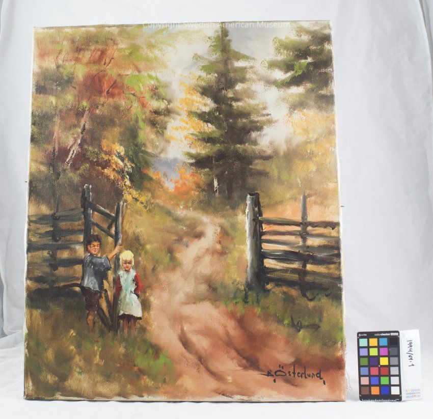 Unframed oil on canvas painting a little boy and a little girl standing by an open gate, beyond which a dirt path winds through trees with autumn foliage. Signed in the bottom right, "B. Österlund."Type of Painting