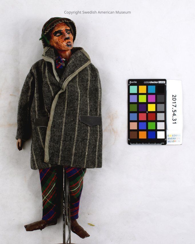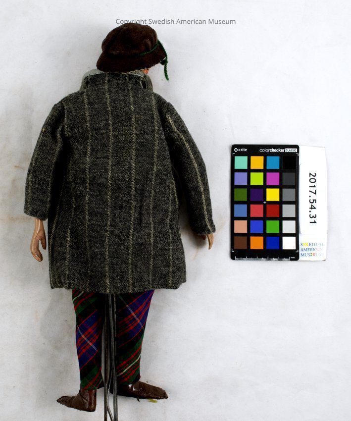Kungsholm Miniature Grand Opera puppet. Male puppet wearing a floppy brown hat, grey striped overcoat, and red-green-blue-black plaid pants.Context
