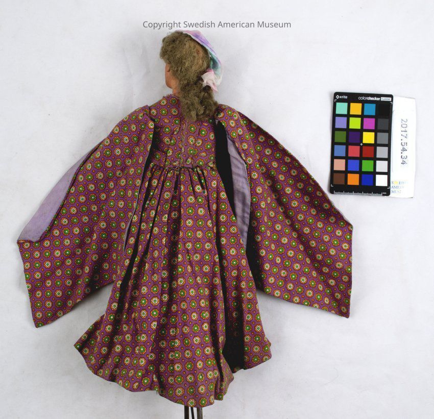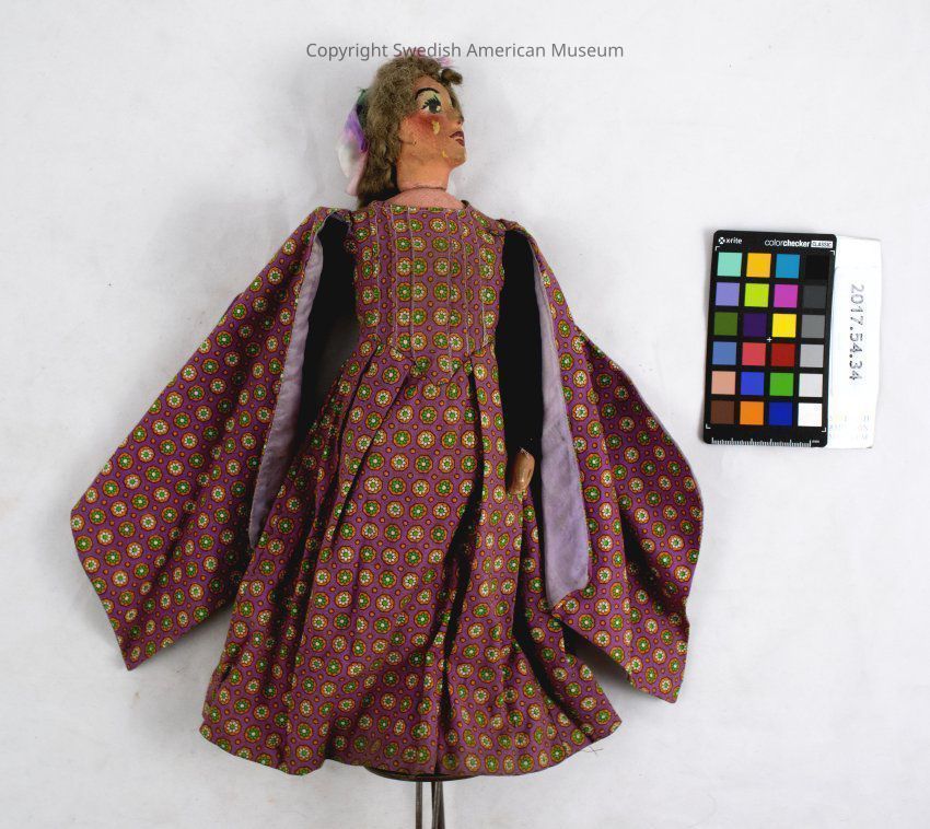 Kungsholm Miniature Grand Opera puppet. Female puppet with light brown hair wearing a lavender, gold and green print dress, a tucked bodice, and velvet sleeves. Chain weights throughout skirt hem. Round metal base with four control wires.Context