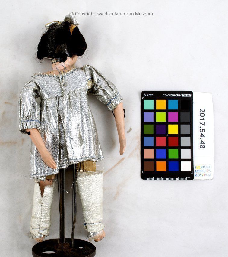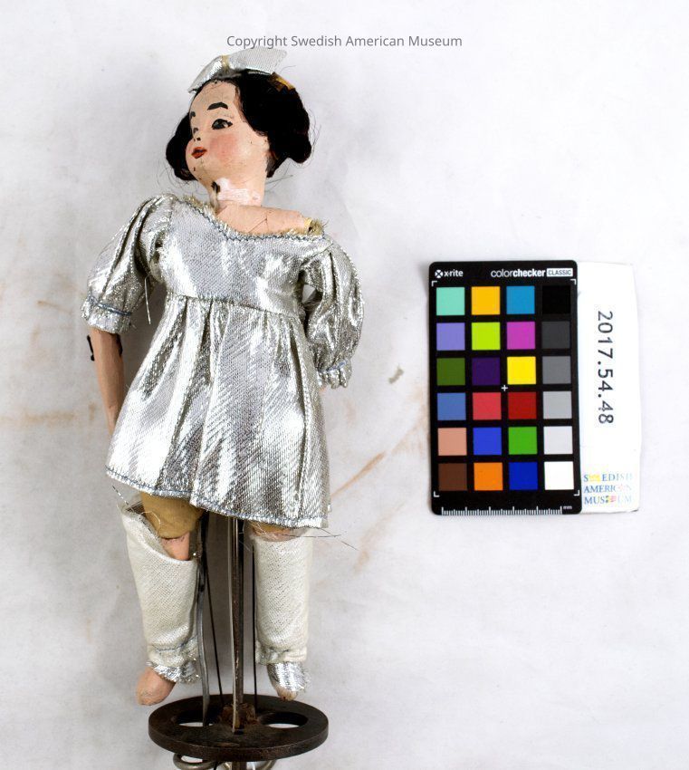 Kungsholm Miniature Grand Opera puppet. Girl in silver and white garments, braided brown hair with silver lamé bow, silver lamé dress and shoes.Context