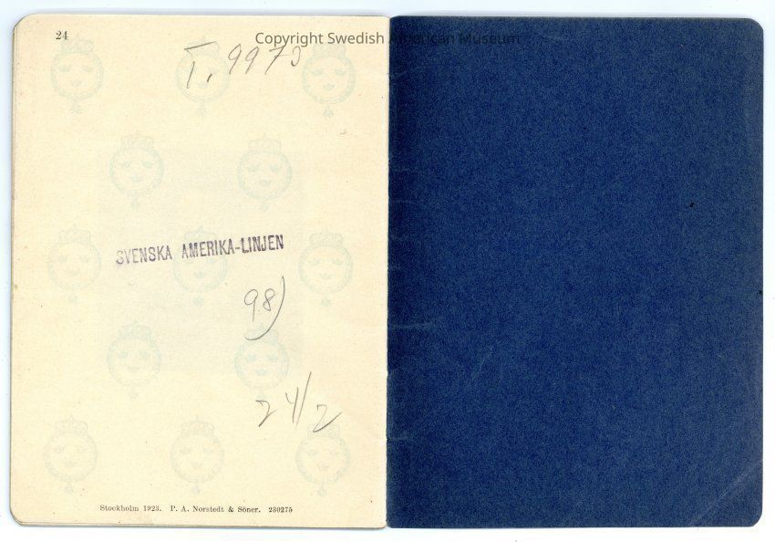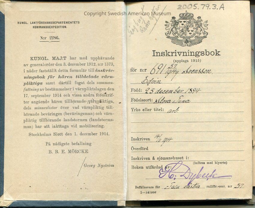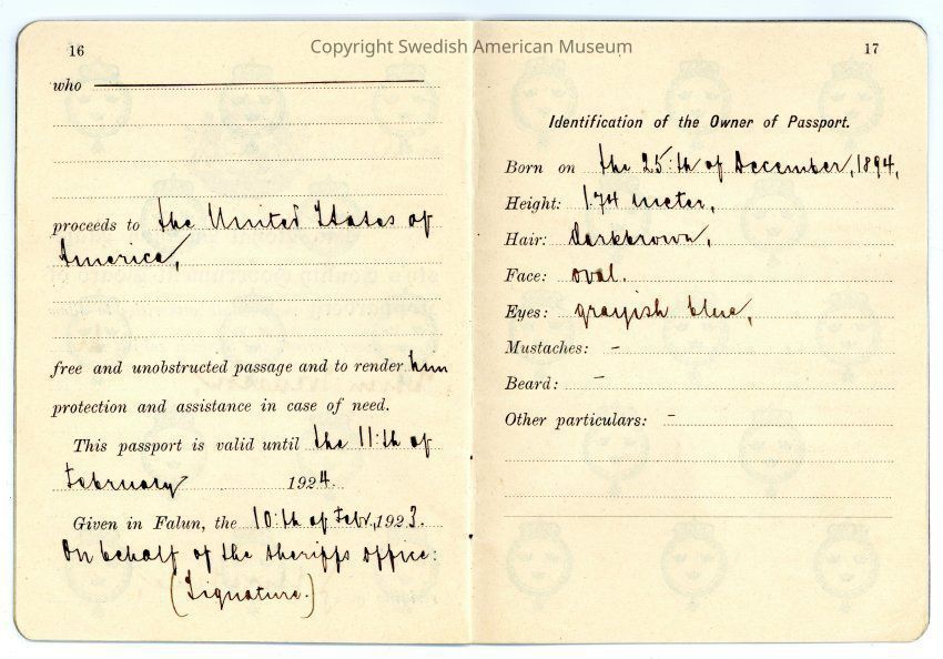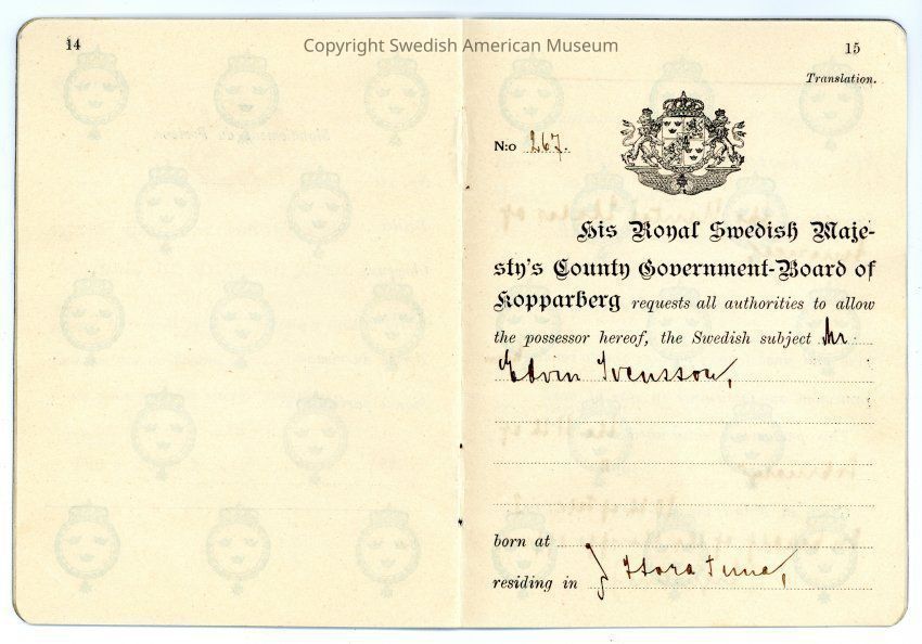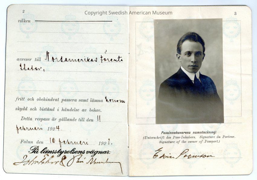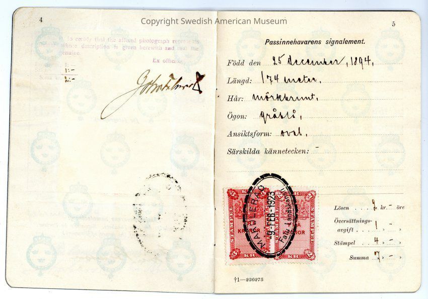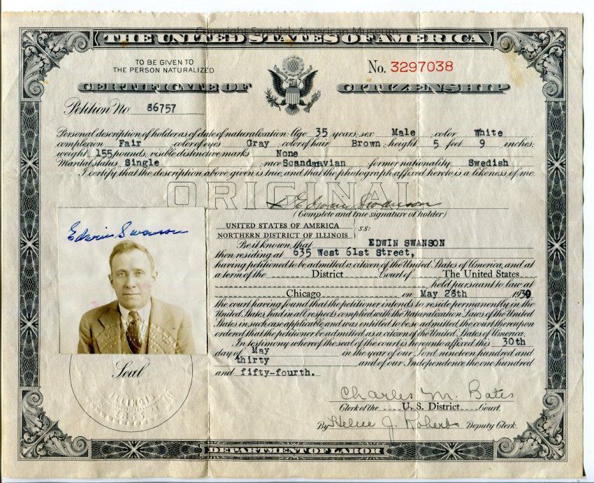 Edvin Svensson (later: Edwin Swanson) was born on Dec. 25, 1894 in Stora Tuna, Dalarna. He worked as a "banarbetare" (railroad worker) in Sweden. He was issued a visa to travel to the United States by the American Consulate General on Feb. 15, 1923 and had 12 months to enter the country. His passport was issued in Falun, Dalarna on Feb. 10, 1923 and expired on Feb. 11, 1924. It granted him the ability to travel back and forth to the United States. He immigrated to Chicago, Illinois and became a United States citizen on May 28, 1930.Acquisition