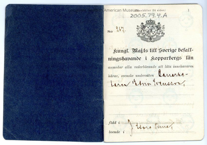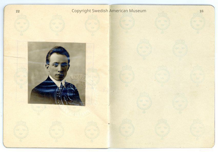 Edvin Svensson's passport from 1923. It is a blue booklet that contains his photograph and personal information.Date(s) of Creation