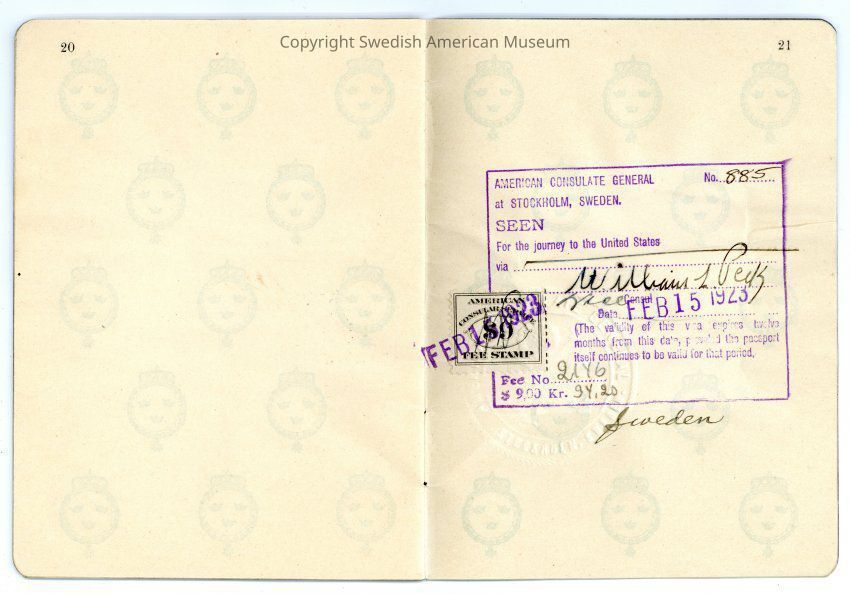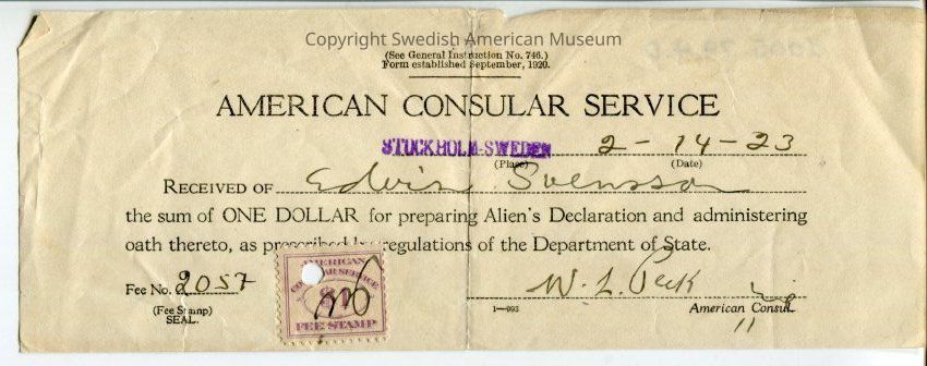 American Consular Service Payment which Edvin Svensson received in 1923 upon his arrival in the U.S. The document was published in 1920.Date(s) of Creation