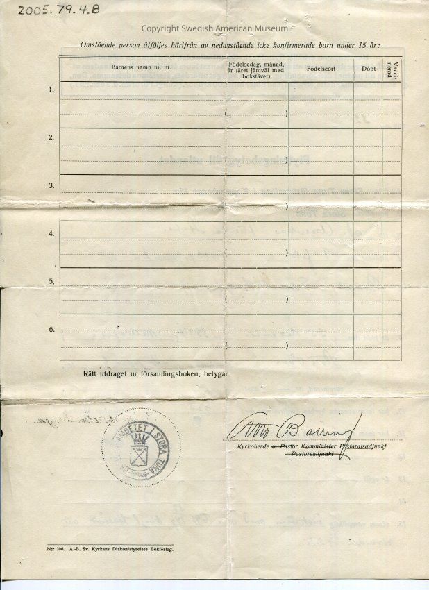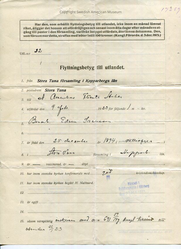 Moving certificate from 1923 for Edvin Svensson that he used when immigrating to United States from Sweden.Date(s) of Creation