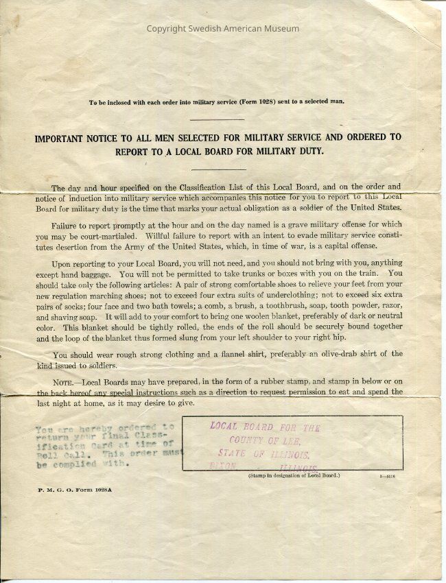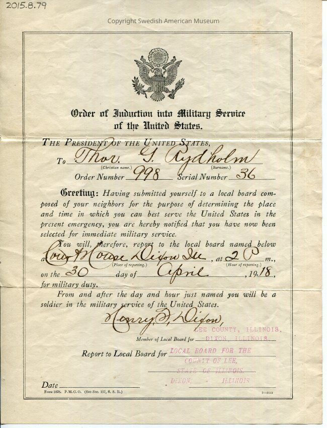 Order of Induction Into Military Service of the United States for Thor Rydholm, dated Apr. 30, 1918. Along with the order are military instructions with the heading “Important notice to all men selected for military service and ordered to report to a Local Board for military duty.”Acquisition