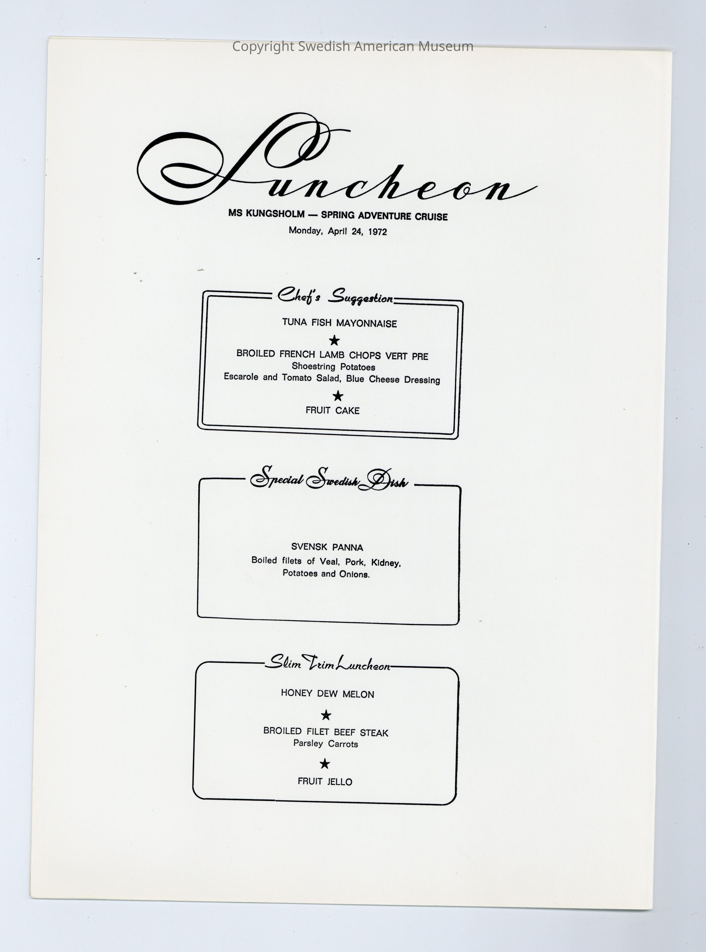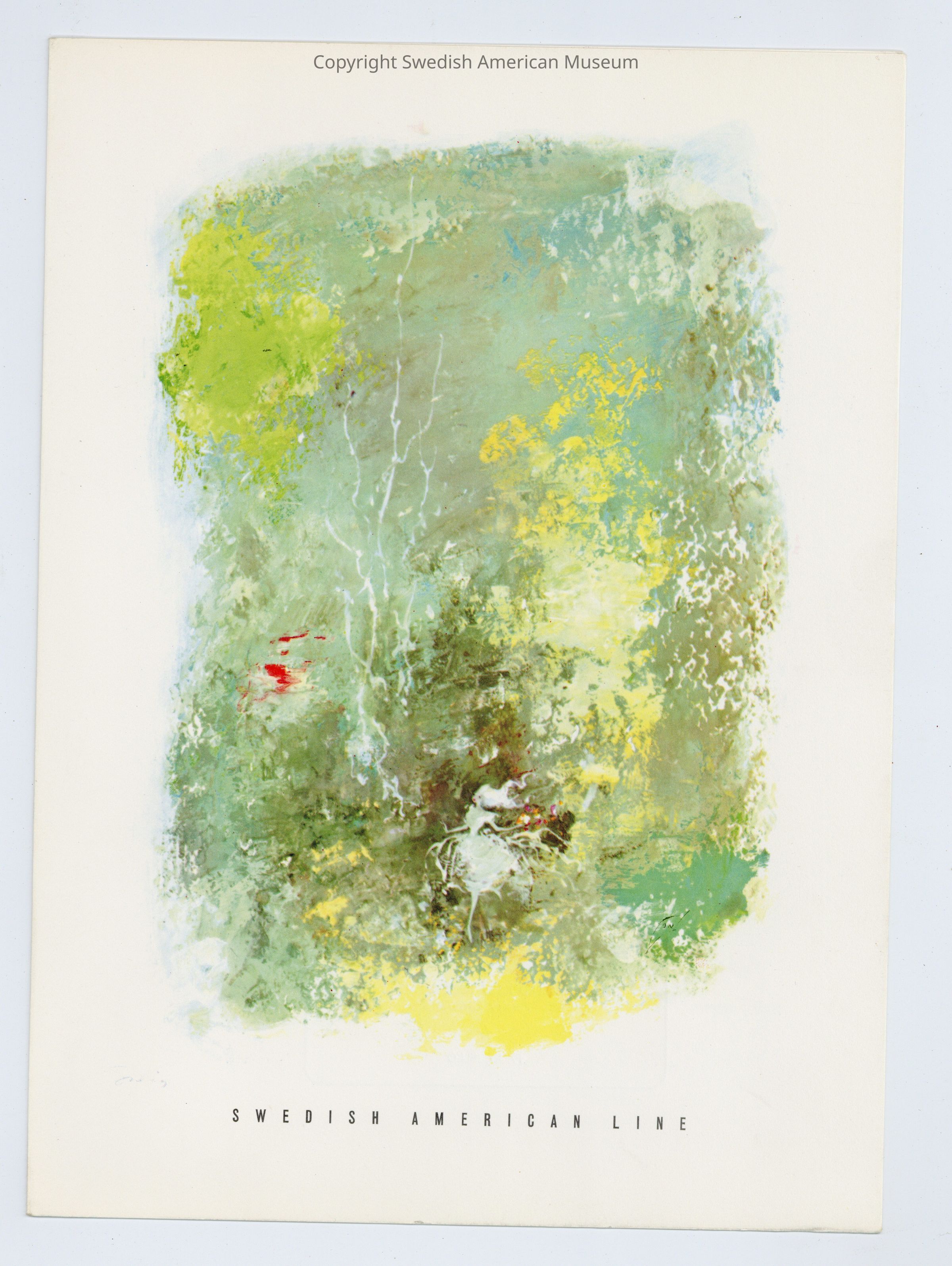 Menu for the Swedish American Line ship M.S. Kungsholm. Spring Adventure Cruise, Luncheon menu. The front of the menu has abstract art in green and yellow colors, with a spot of red paint. There appears to be a woman painted in white in a dress with flowing hair, walking through a grove.Context