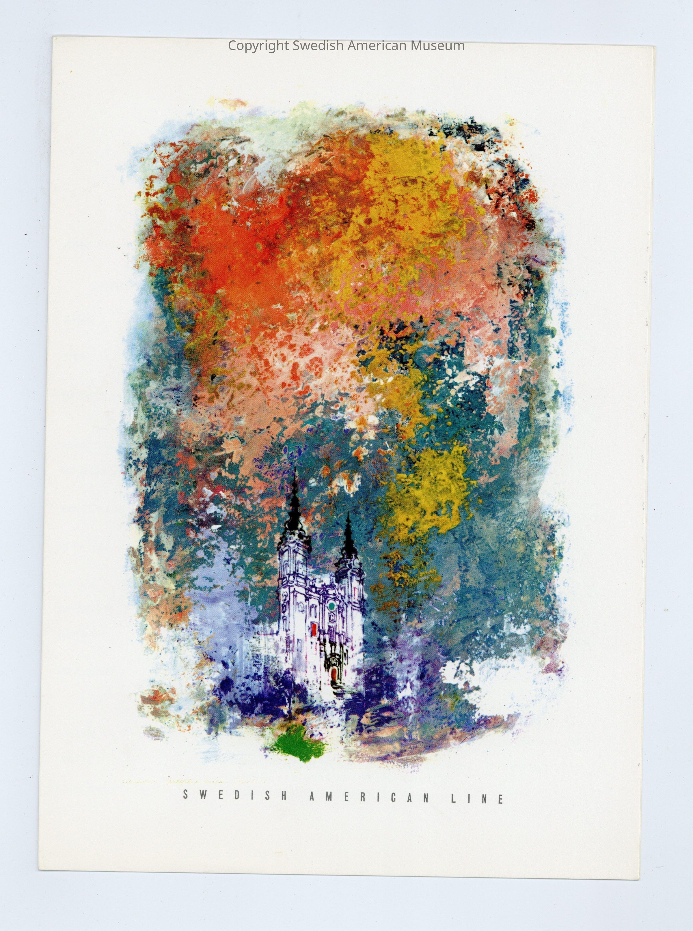 Menu for the Swedish American Line ship M.S. Gripsholm. Mediterranean Cruise. Dinner menu. The front features abstract art with splotches of teal, yellow, orange, and some blues. At the bottom of the composition, there is a drawn ornate building.Context