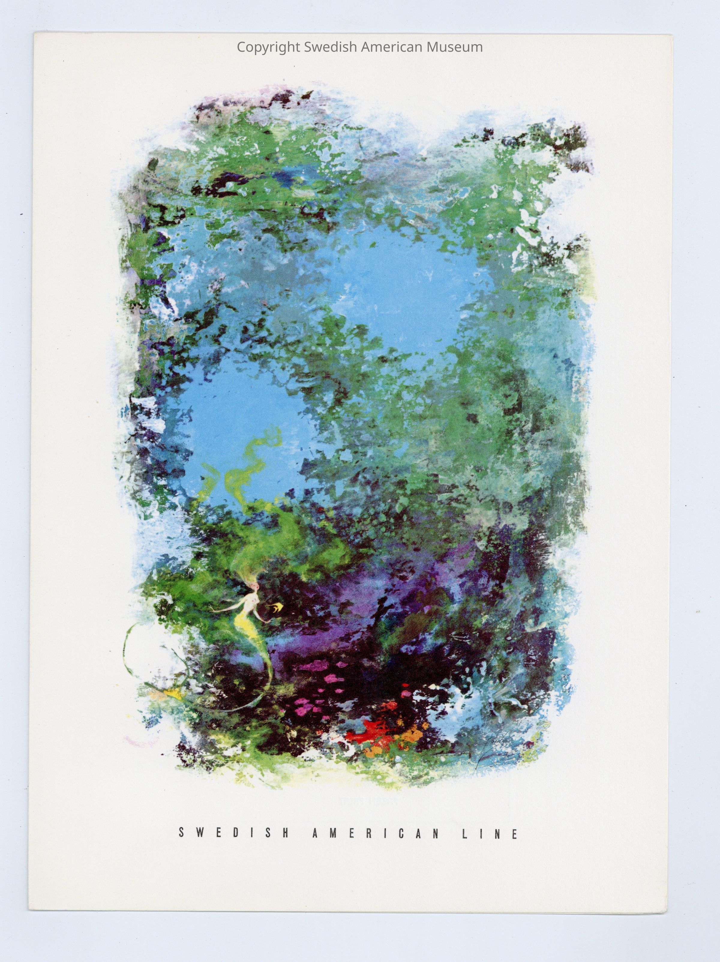 Menu for the Swedish American Line ship M.S. Kungsholm. Spring Adventure Cruise. Luncheon menu. The cover has abstract art depicting an underwater scene with a mermaid and a fish at the bottom left of the composition. The art is mainly a mixture of blues and greens with some purple and yellow as well.Context