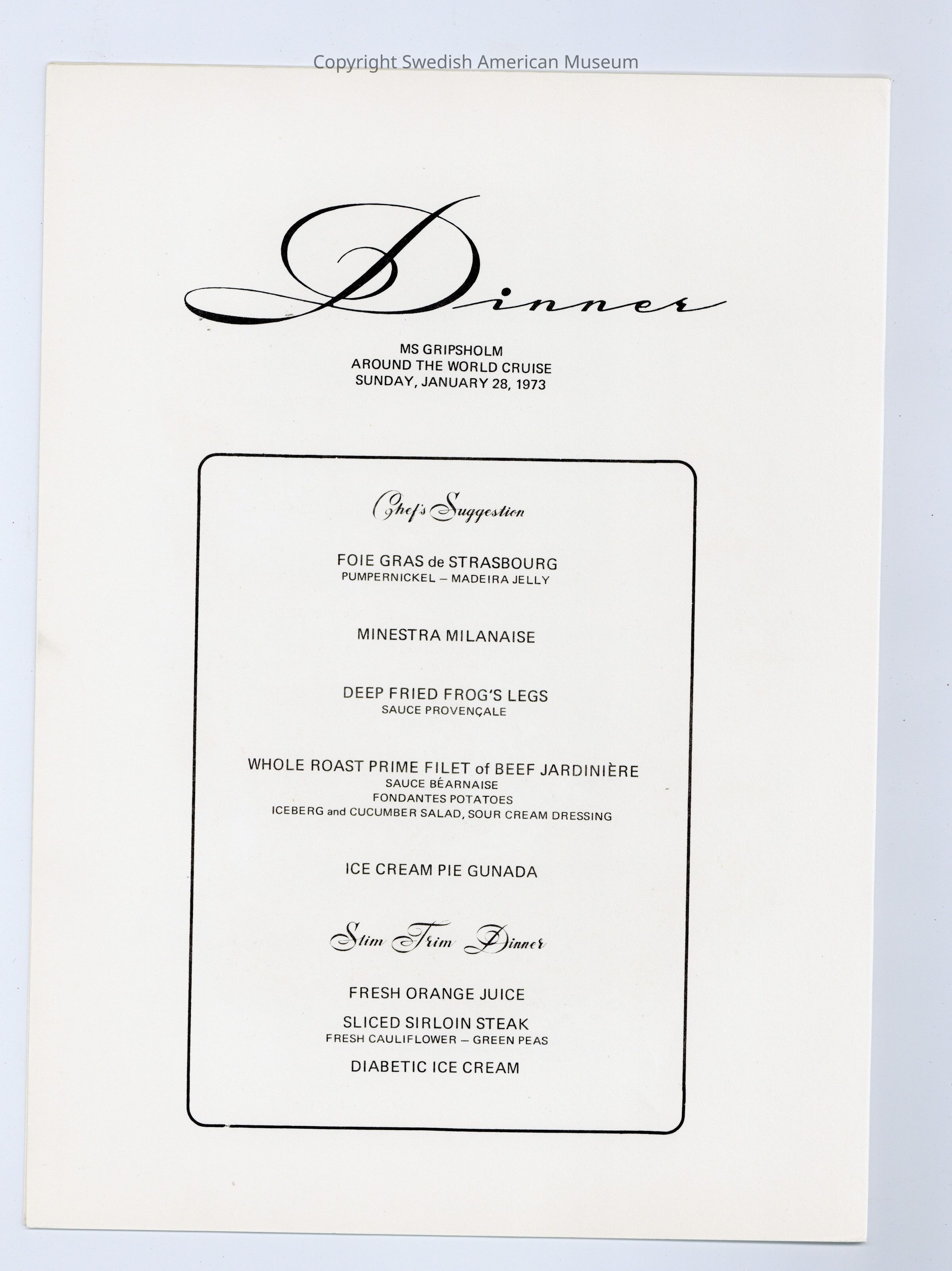 Menu for the Swedish American Line ship M.S. Kungsholm. Around The World Cruise. Dinner menu. Cover features artwork with a seahorse surrounded by a swirl of yellow, blue, and white circles, with the background being a painted ocean scape.Context