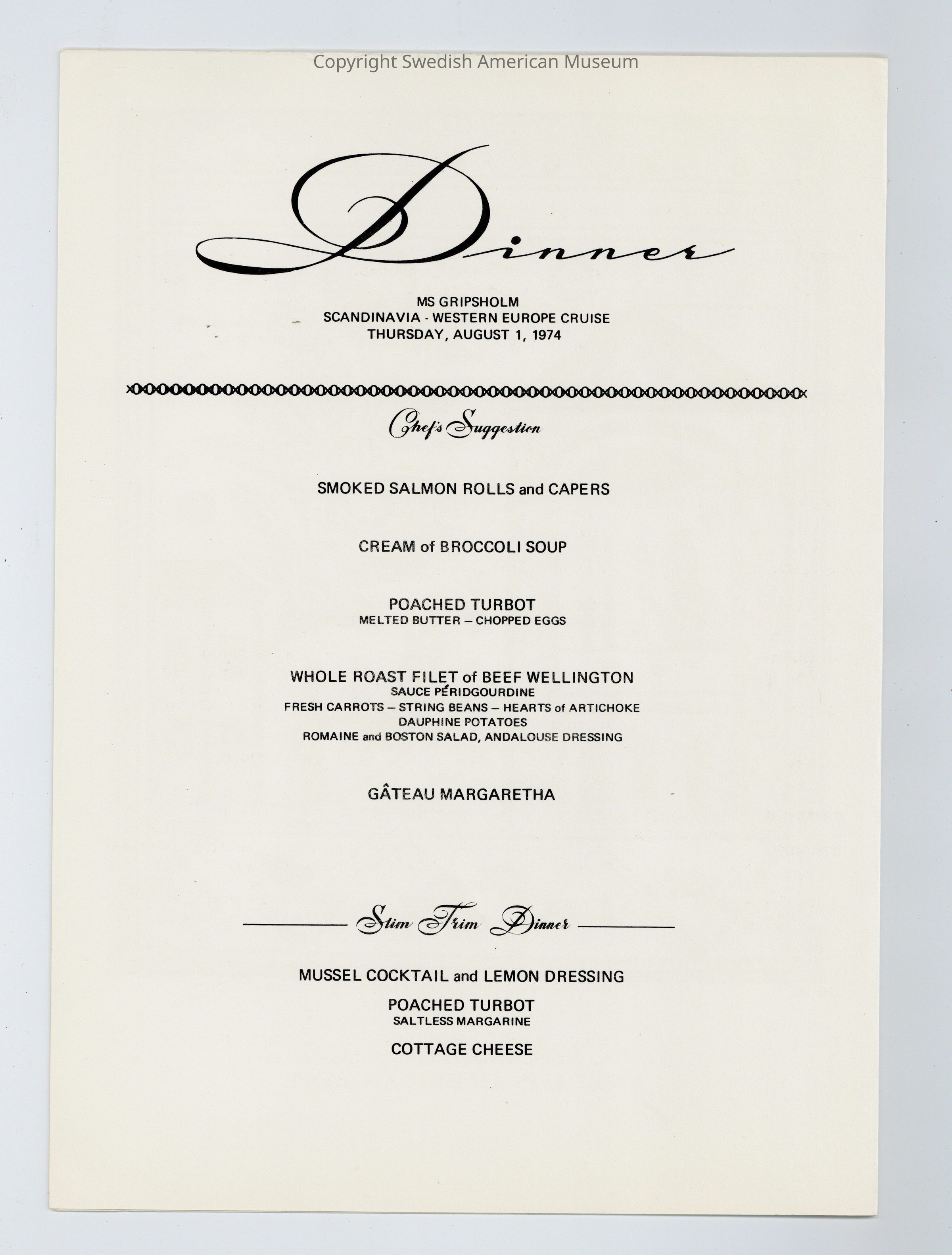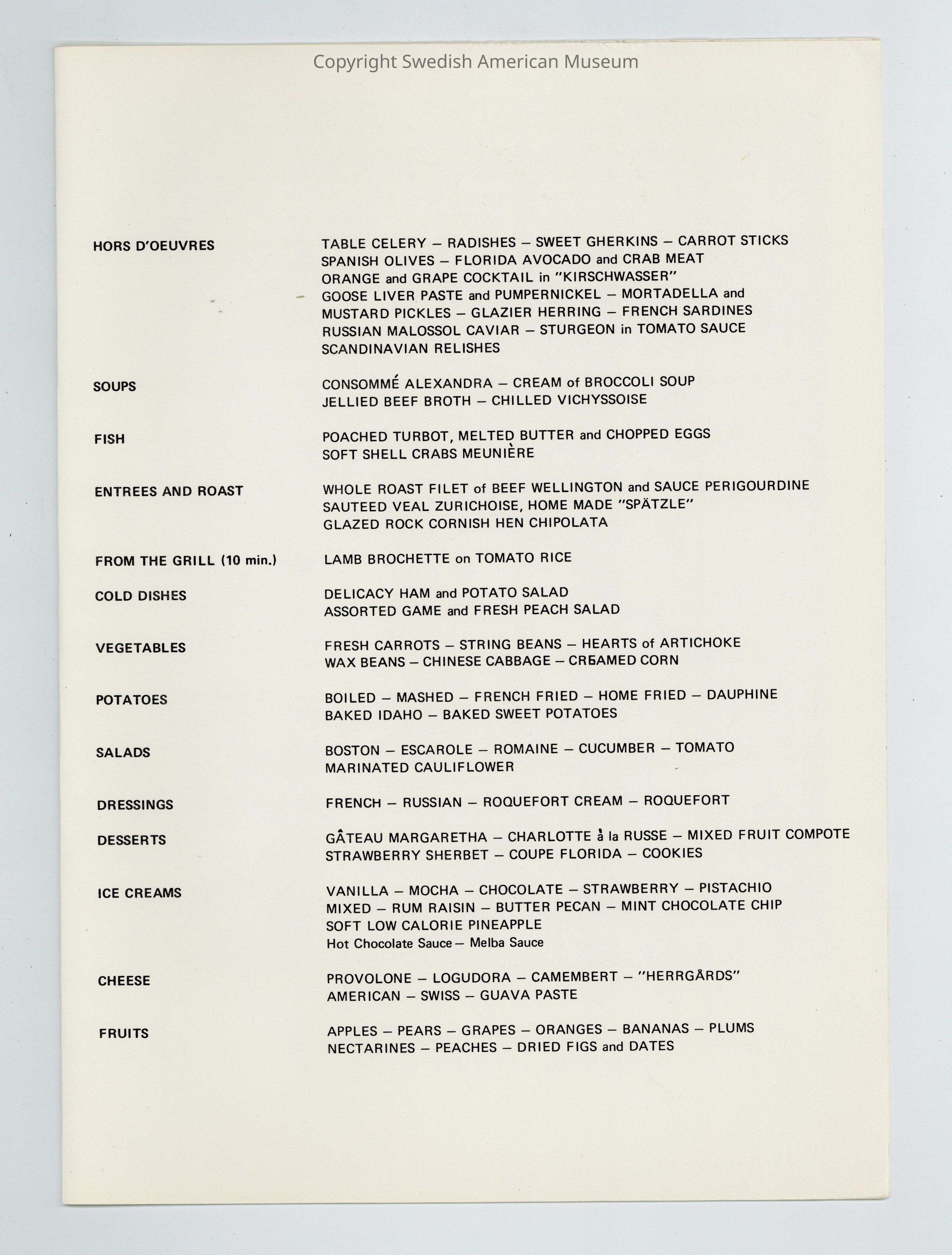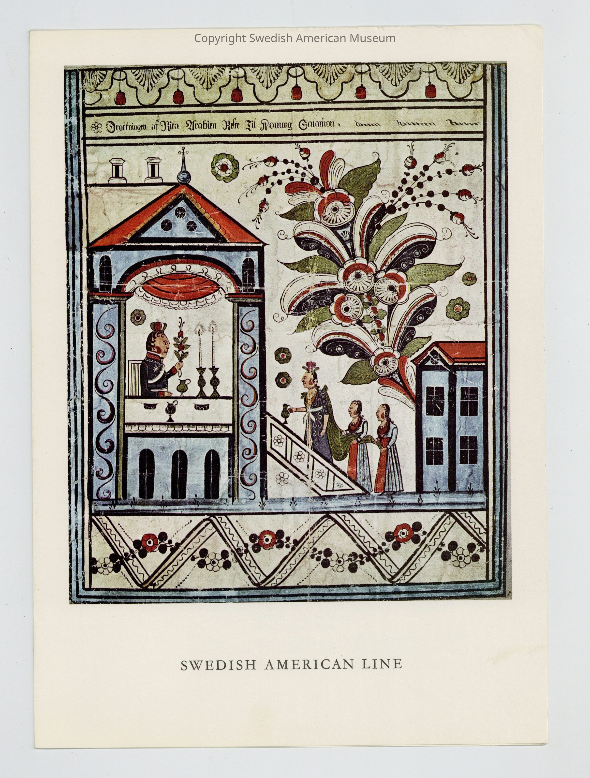 Menu for the Swedish American Line ship M.S. Gripsholm. Dinner with a dalmålning or bonad style art motif titled "King Solomon and the Queen of Sheba".