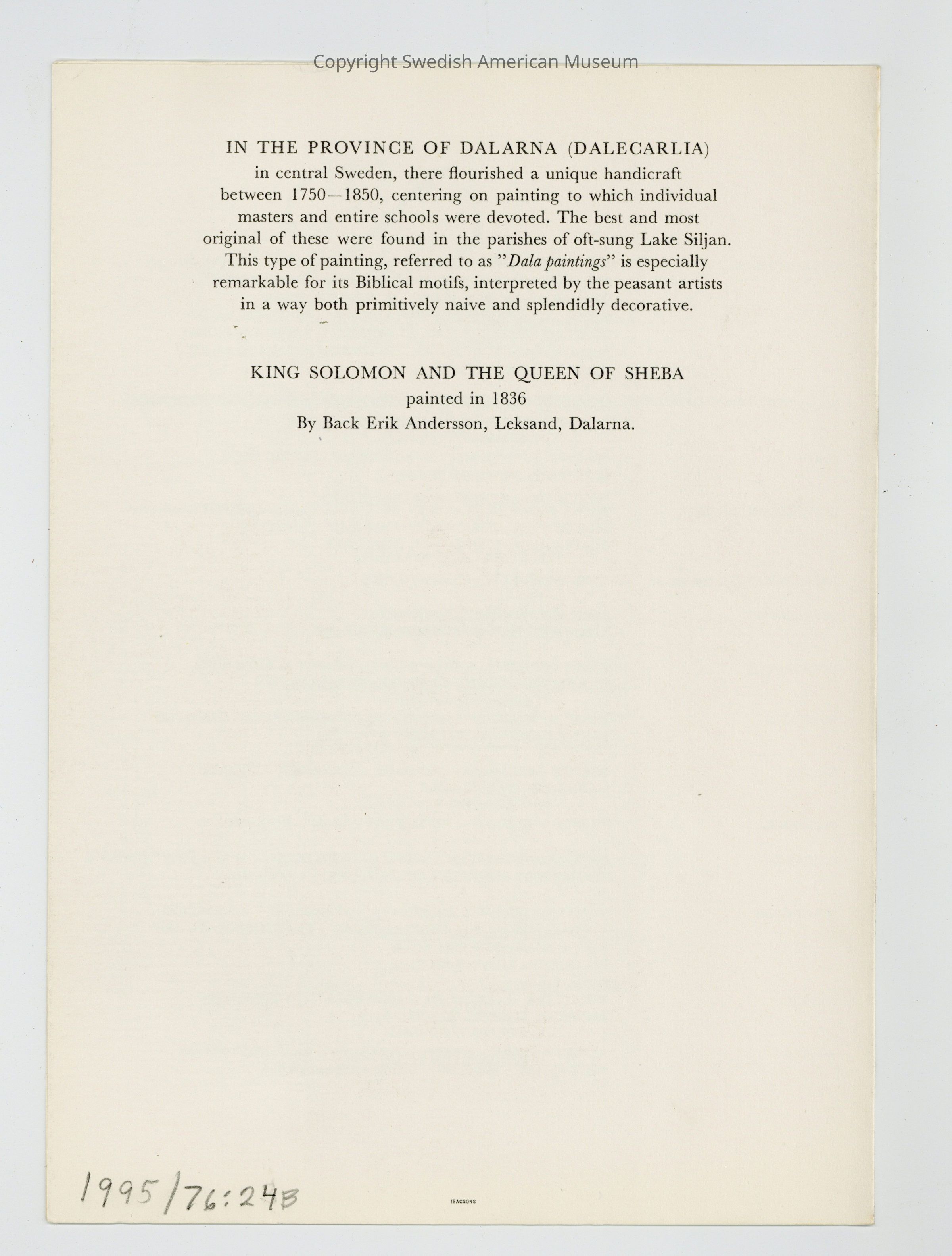 Ownership was legally transferred to the Swedish American Museum per the gift agreement. Certain works may be protected by copyright not governed by the Swedish American Museum.