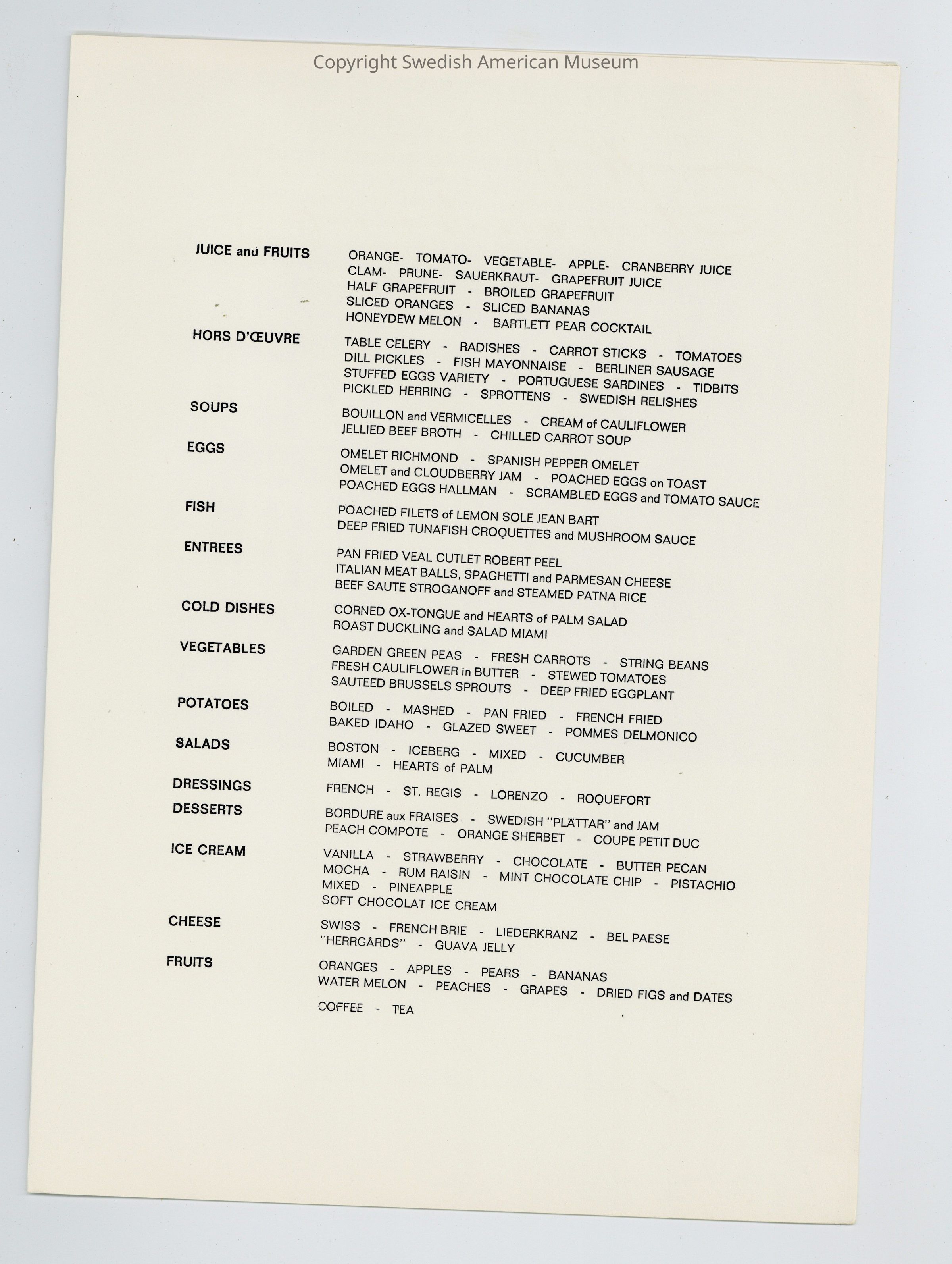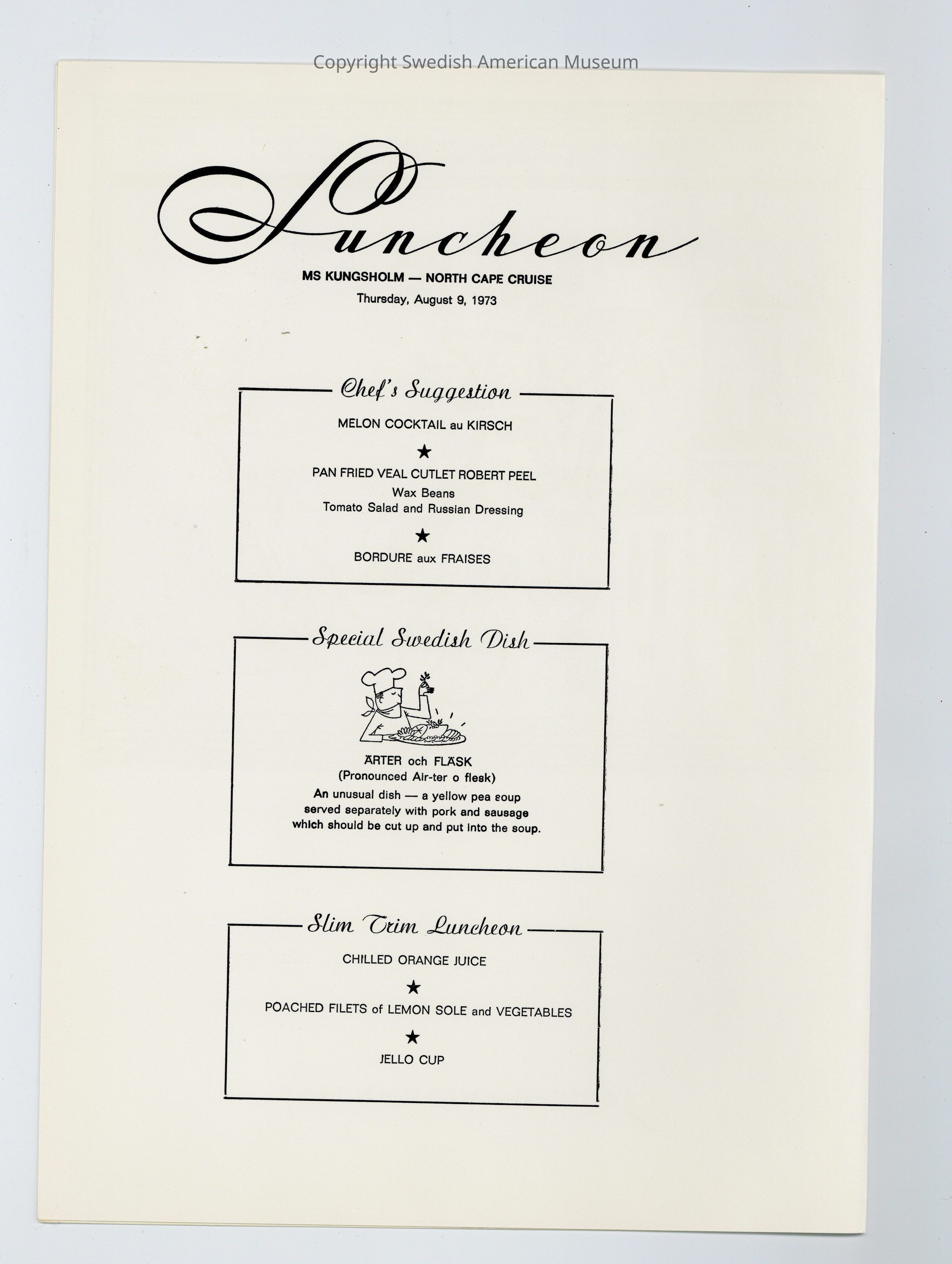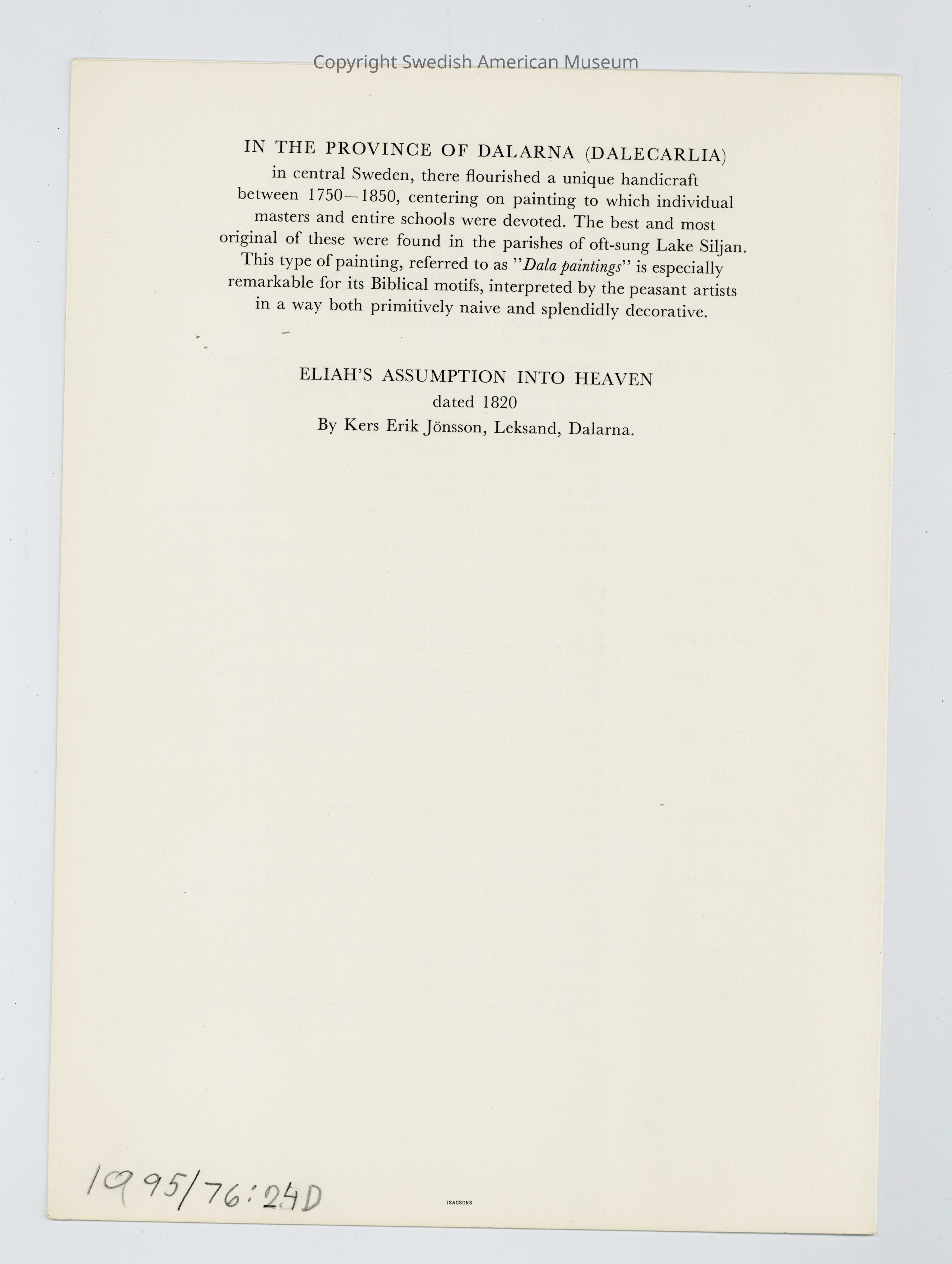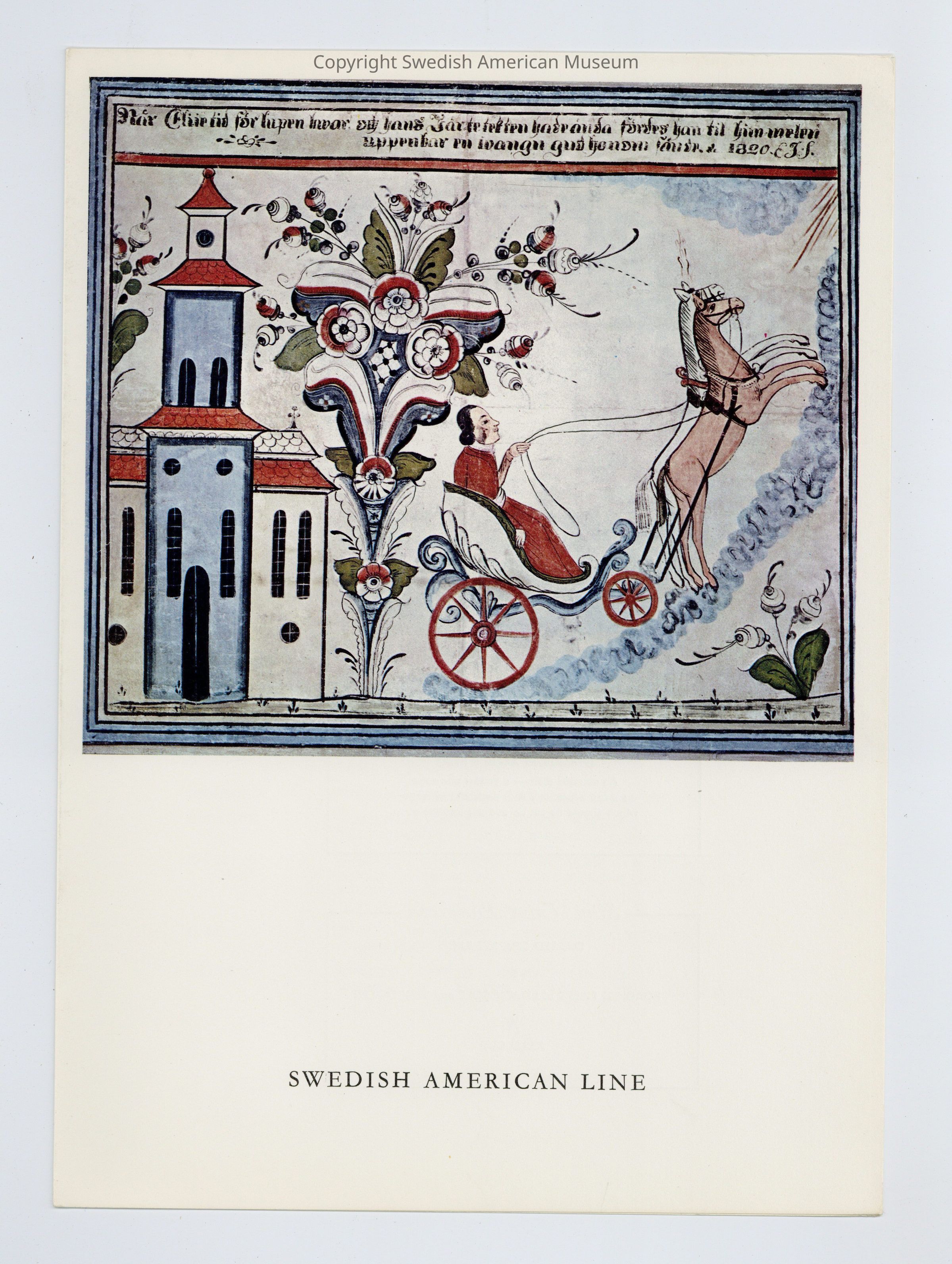 Menu for the Swedish American Line ship M.S. Kungsholm. Luncheon with a dalmålning or bonad style art motif titled "Eliah's Ascension Into Heaven".