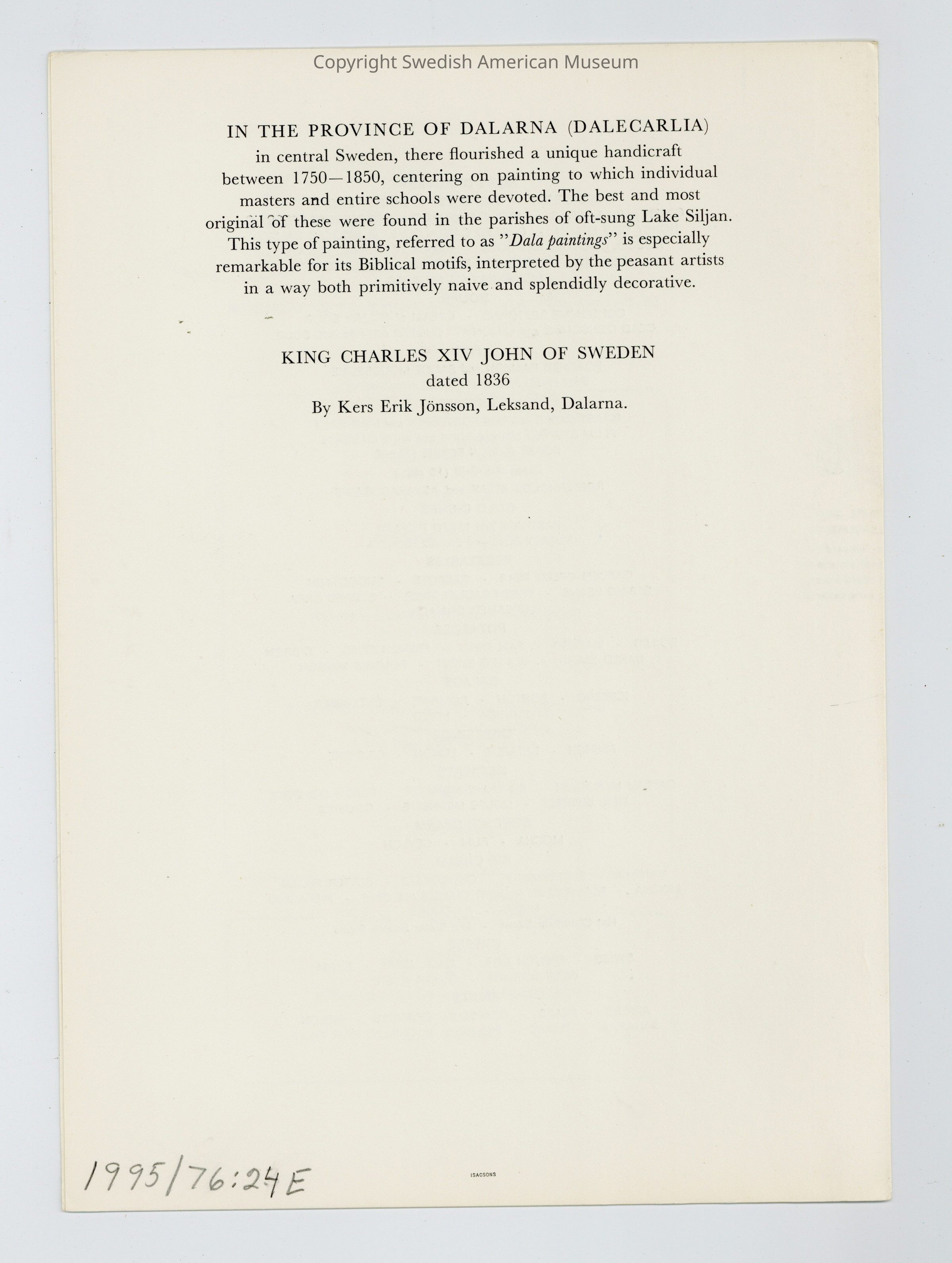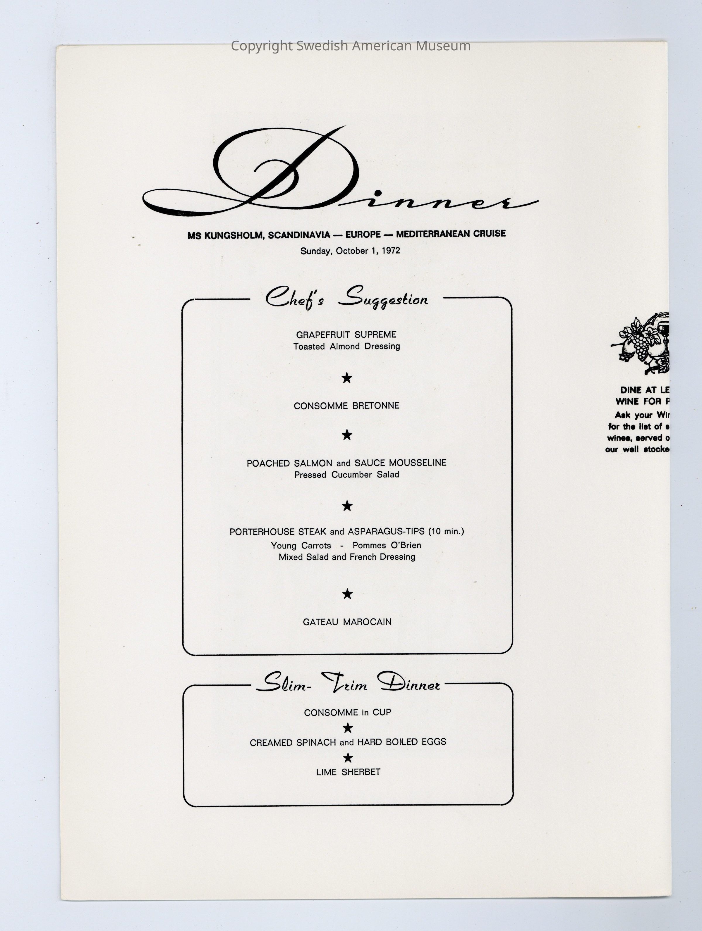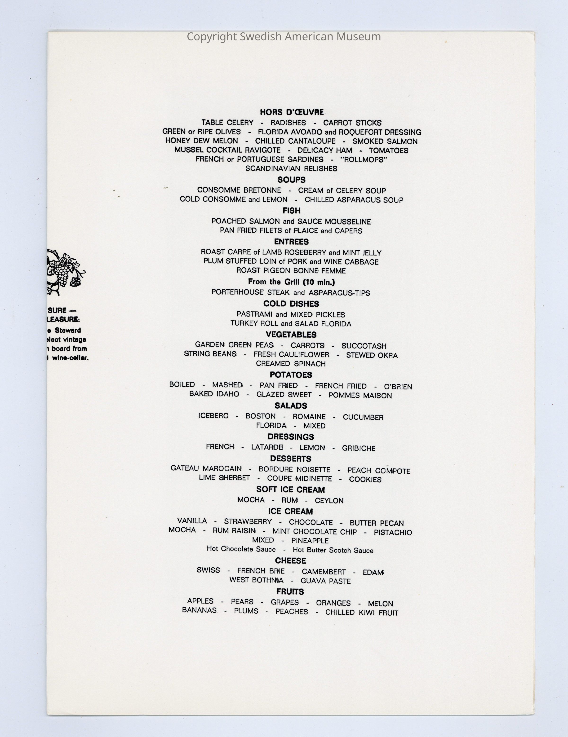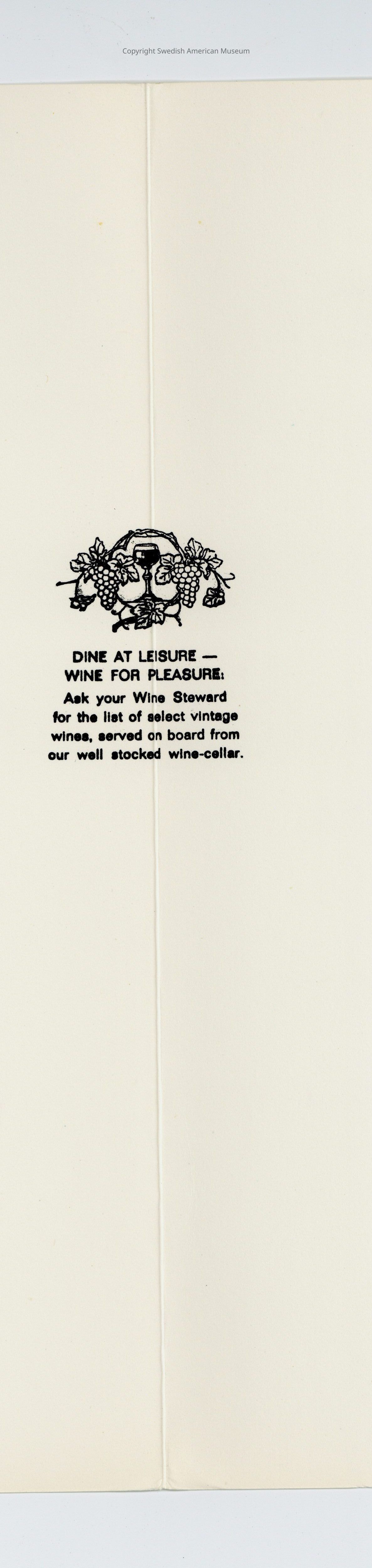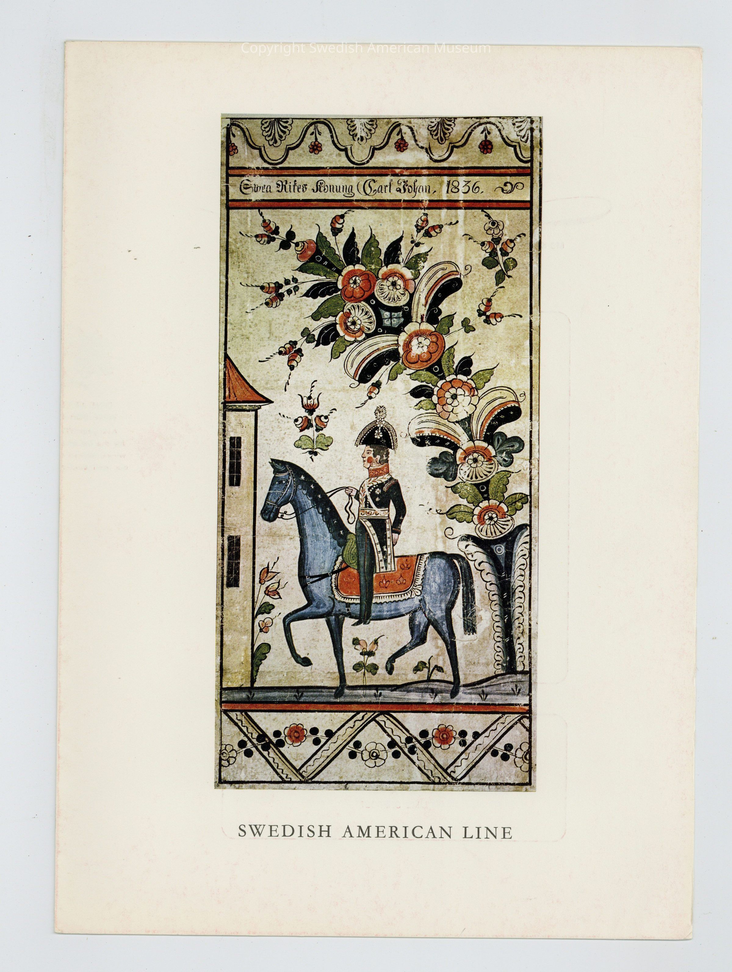 Menu for the Swedish American Line ship M.S. Kungsholm. Dinner menu with a dalmålning or bonad style art motif titled "King Charles XIV John of Sweden."