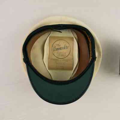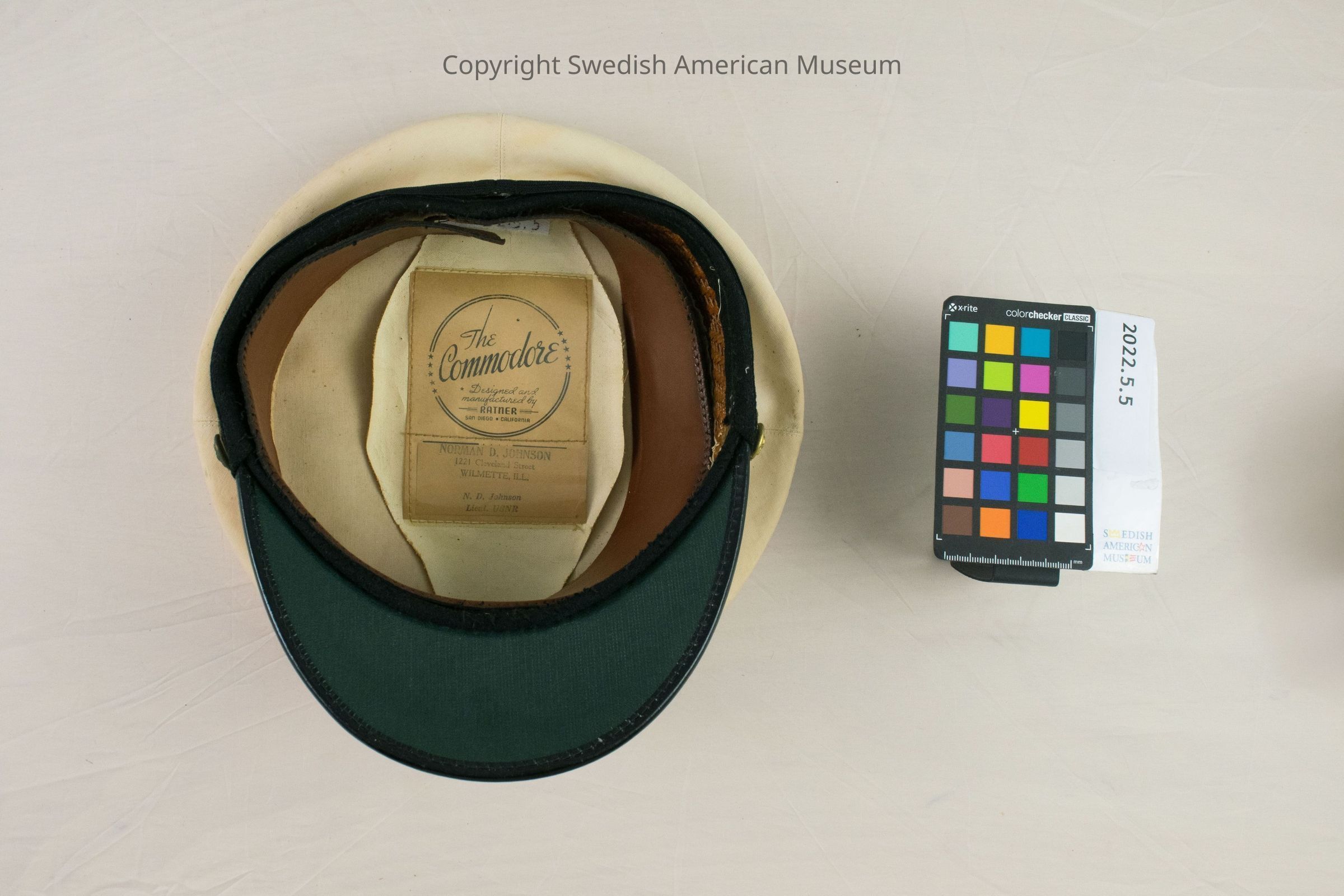There is also a large tag on the inside that says "The Commodore, Designed and manufactured by Ratner, San Diego, California." Below that is a secnd tag that says "Norman D. Johnson, 1221 Cleveland Street, Wilmette, ILL. N.D. Johnson, Lieut. USNR." Both tags are encased in a plastic sleeve.Acquisition