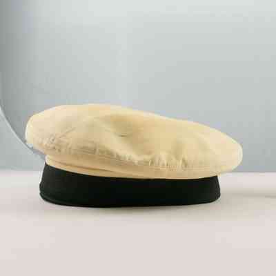 Hat part of a uniform worn by Norman D. Johnson when he served in the US Navy during WWII. The hat has a black lip and mostly white top. There is a gold band along the front and a black band behind that. On the front is a gold painted elblem of two anchors crossed with ropes around them. This brass peice is held on to a piece of felt with a screw in the center of the cross.