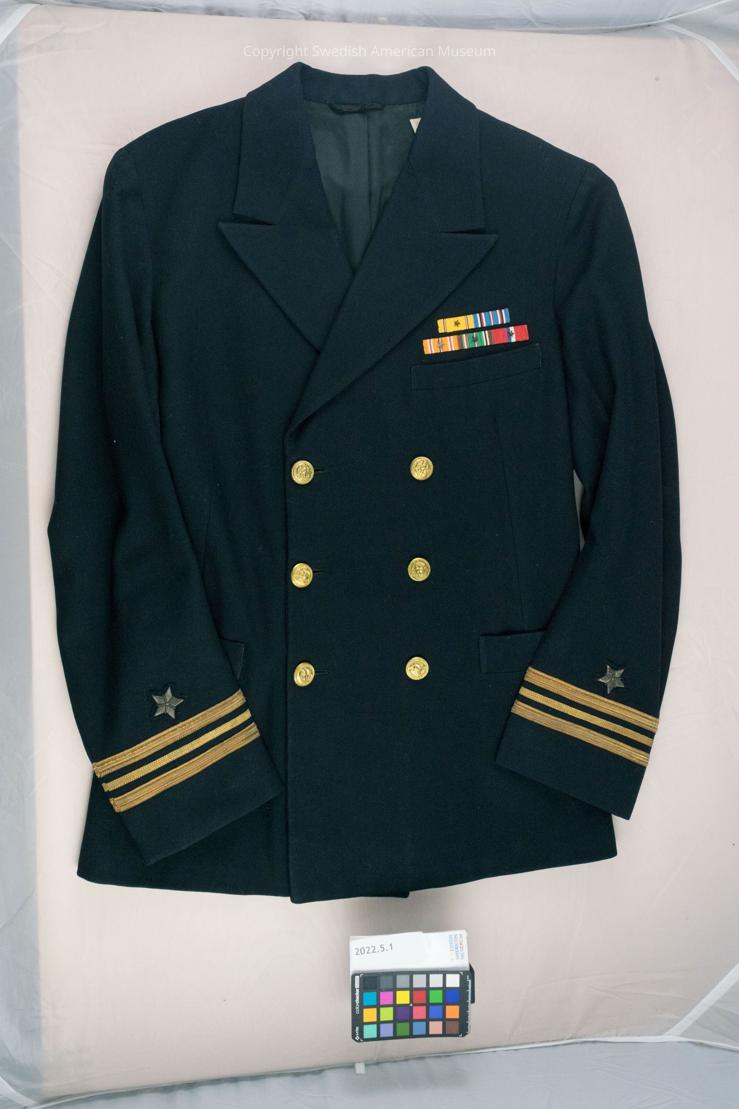 Jacket worn by Norman D. Johnson when he served in the US Navy during WWII. The jacket is part of a Ex O uniform worn for formal occasions.