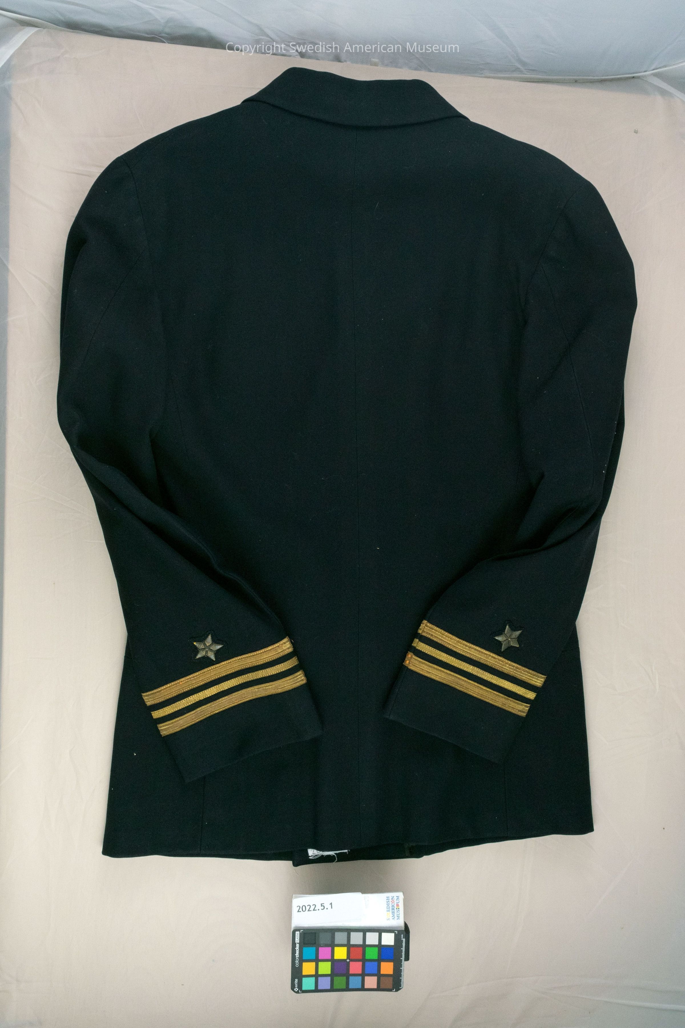 The coat is blue with six buttons down the center. On each sleeve are three gold bands and a gold star (the color has faded). Just below the inside right breast pocket is the tag "Desmond's" indicating the maker. At the top left on the inside is "Norman Johnson" written on a white cloth and glued into the lining.