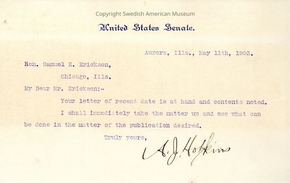 Letter to Sam Erickson from U.S. Senate as record of receiving Ericksons' letter May 11, 1903.Acquisition
