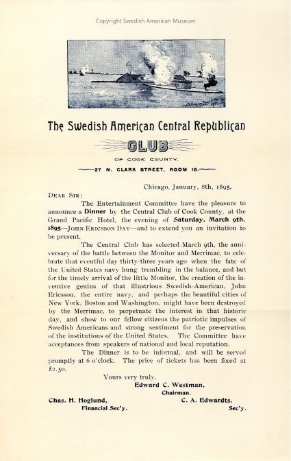 Envelope to Hon. L.M. Norling from the Swedish American Central Republican Club with invitation to John Ericsson Day Dinner March 9, 1895.Acquisition