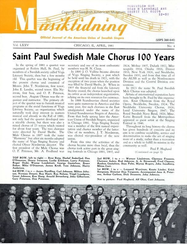 Printed journal of the American Union of Swedish Singers Magazine, April 1981, "Musiktidning." Vol. LXXV No. 4.Context