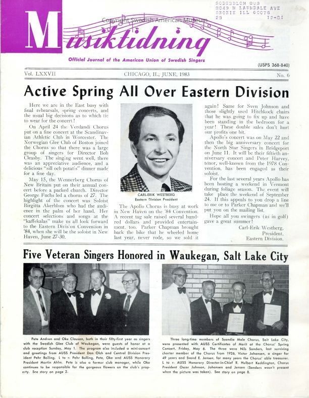 Printed journal of the American Union of Swedish Singers Magazine, June 1983, "Musiktidning." Vol. LXXVII No. 6.Context