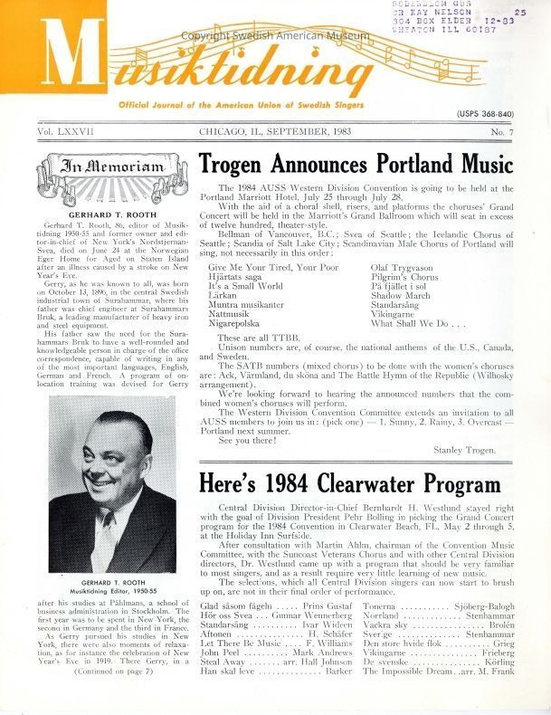 Printed journal of the American Union of Swedish Singers Magazine, September 1983, "Musiktidning." Vol. LXXVII No. 7.Context