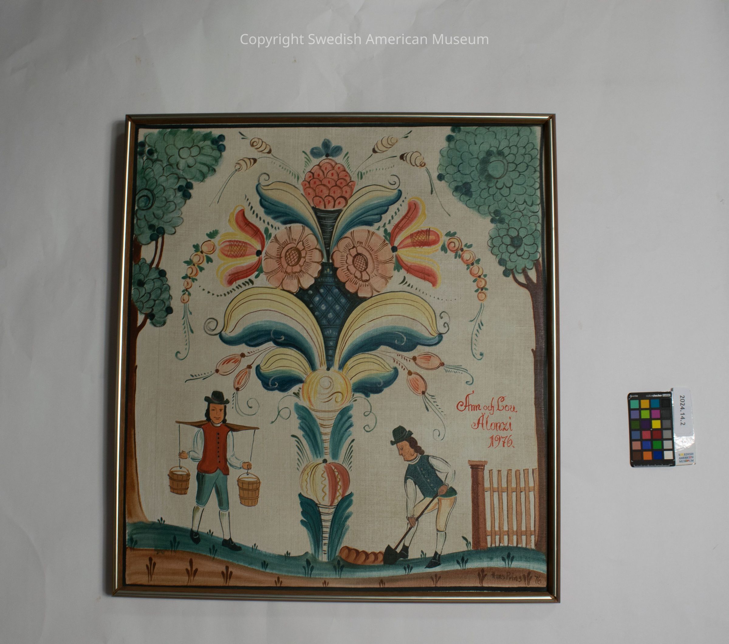 Framed dalmålning-style original oil painting by Hans Prins (1976). This painting depicts traditional folk art with symmetrical floral patterns and scenes of everyday life. In the middle is an intricate floral arrangement stemming from a vase. The flowers are painted in bright reds, blues, and oranges. On either side of the central floral design are two figures working. On the left, one carries two buckets over his shoulder. On the right, one is working with a tool, appears to be digging or planting.Type of Painting
