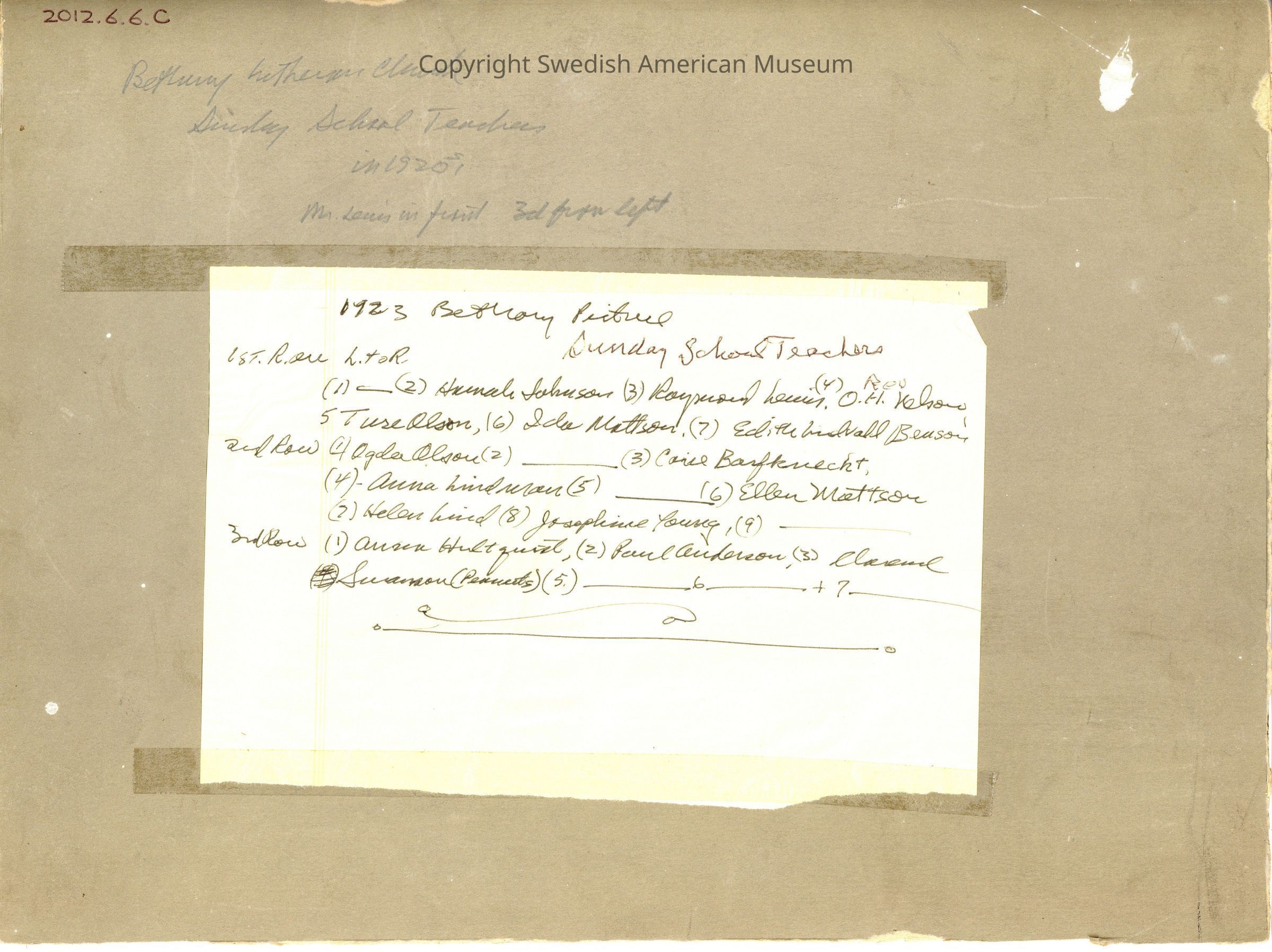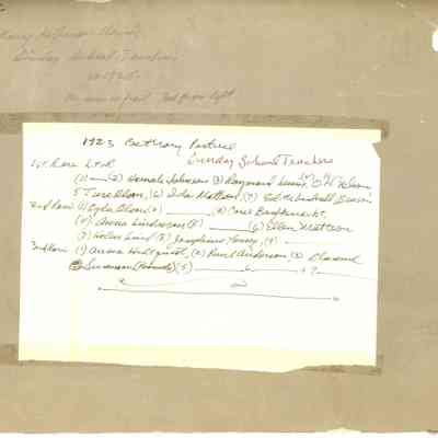 This is a set of four photographs of Pastor Nelson and his family that were taken in the early or mid 20th. century, all of which are related to Chicago's Bethany Church in one way or another. With the exception of Pastor Nelson, all of the people in the photo are Sunday School teachers and the names of 14 of them are listed on the back of the picture.Acquisition