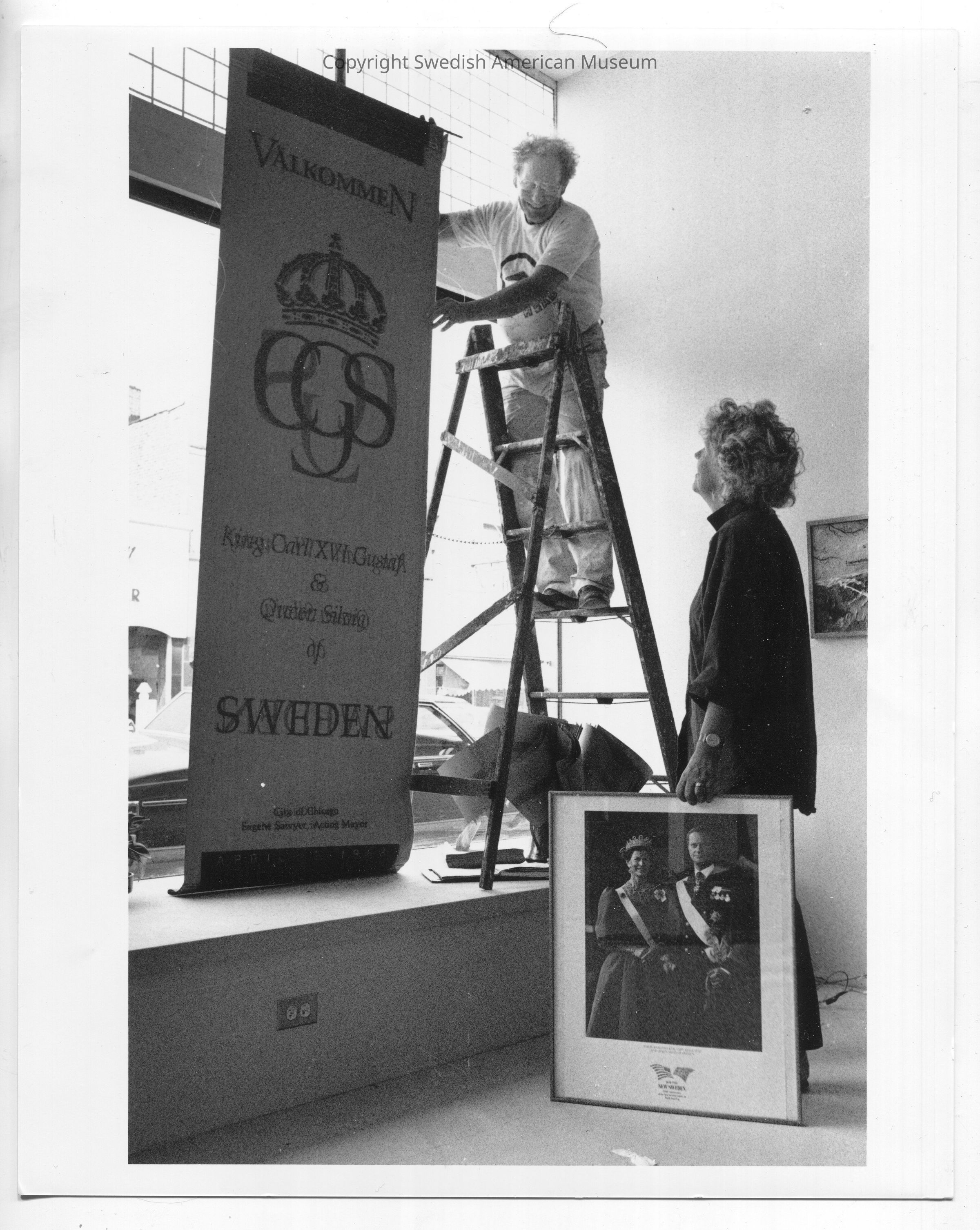 A black and white photograph depicting Kerstin Lane and Kurt Mathiasson putting up a welcome banner in the Swedish-American Museum's front window for King Carl XVI Gustaf and Queen Silvia's visit to Andersonville, Chicago in 1988.