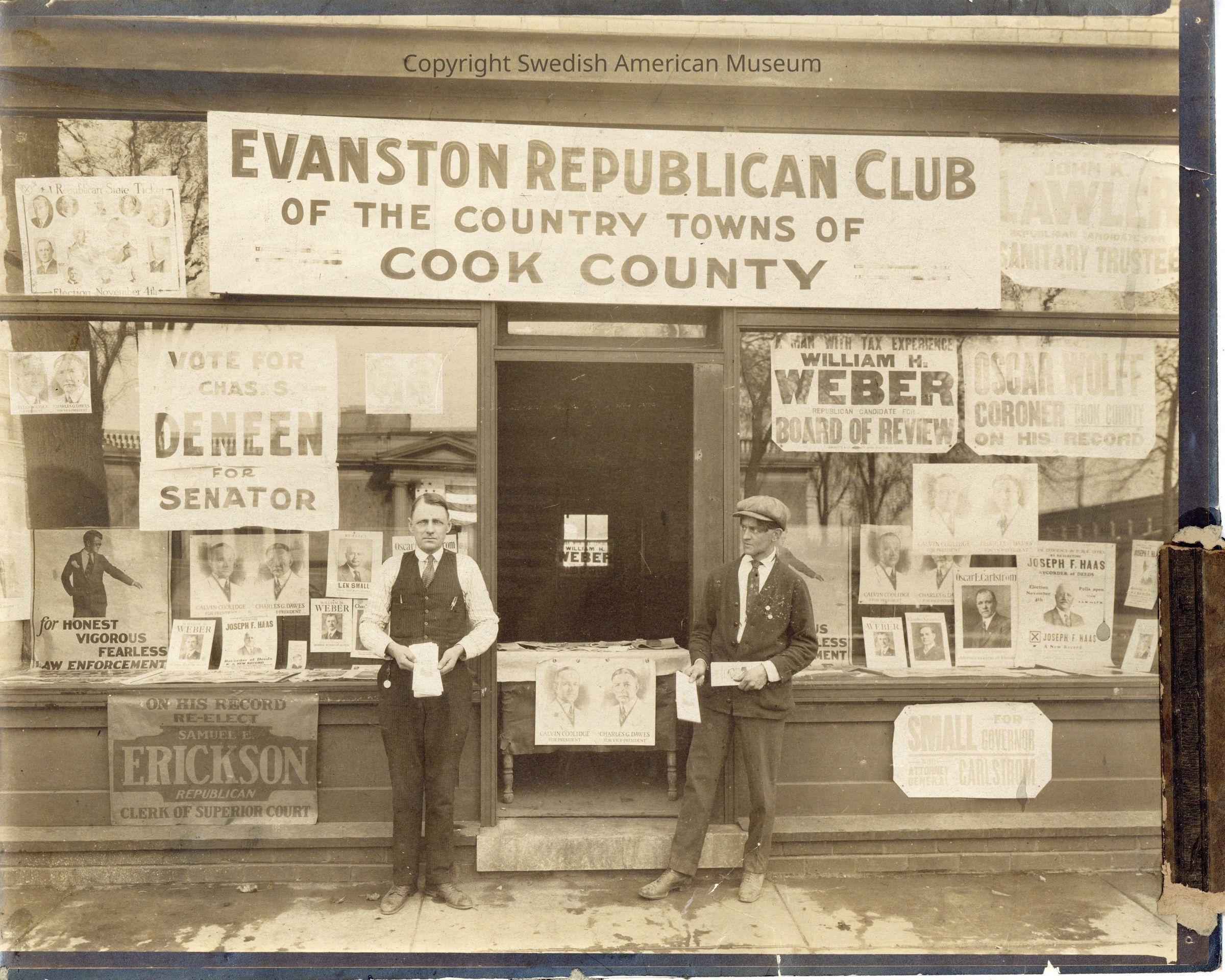 Photo outside the Evanston Republican Club with Sam Erickson Banner visible.