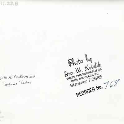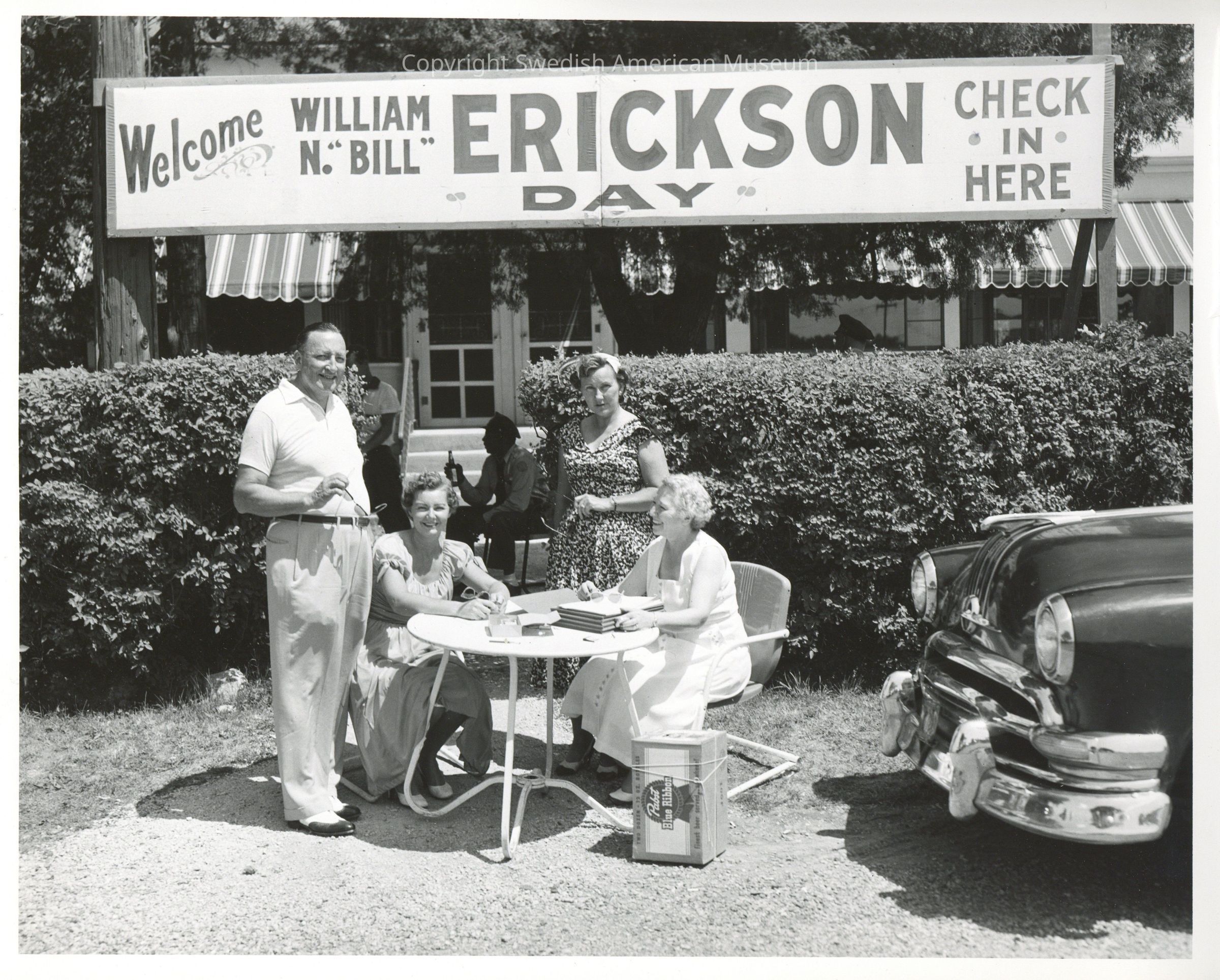 Photo of a group sitting around a table outside for 'William Erickson Day' 1940-1950.