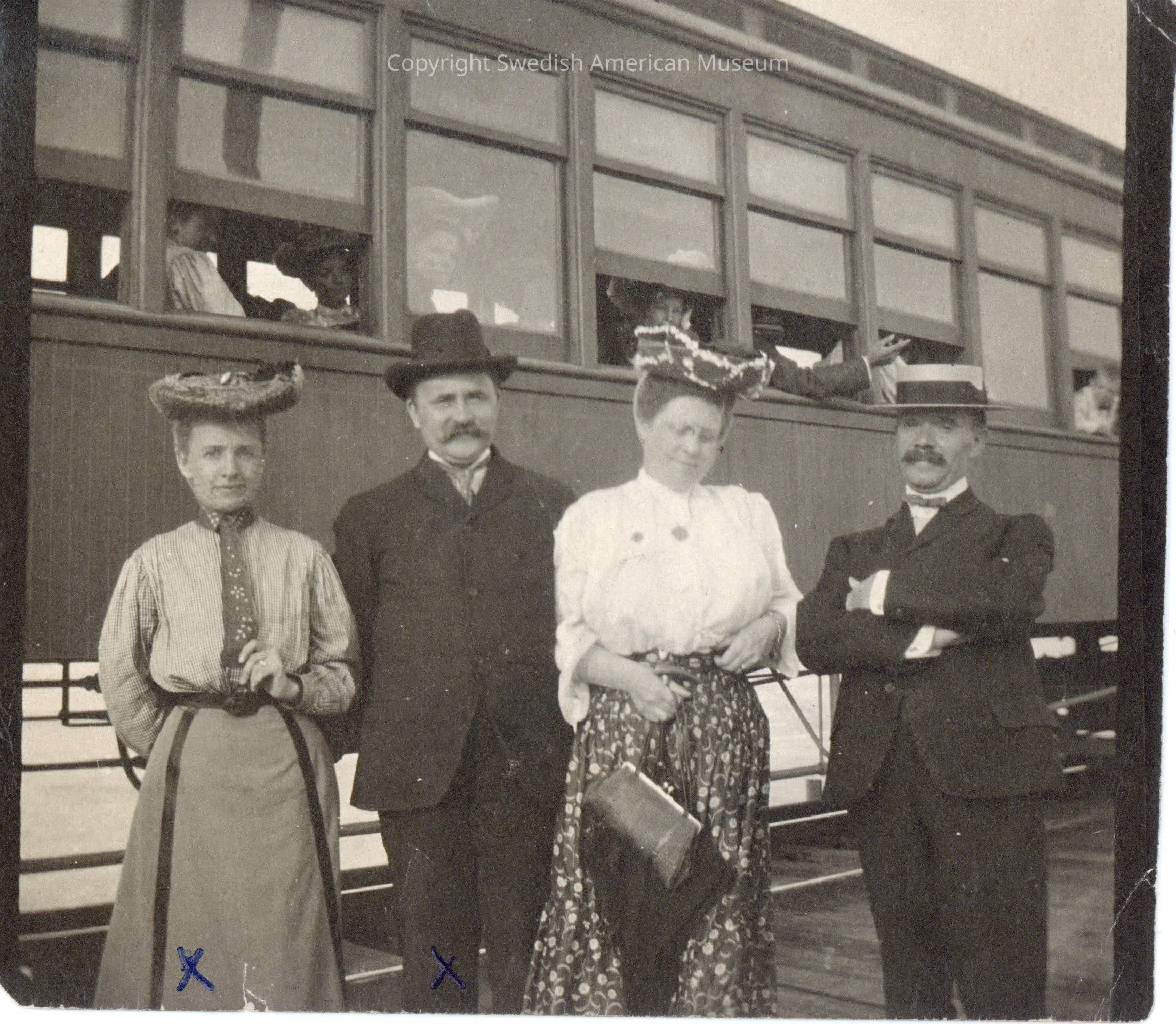 Photo of couples in front of a train car.