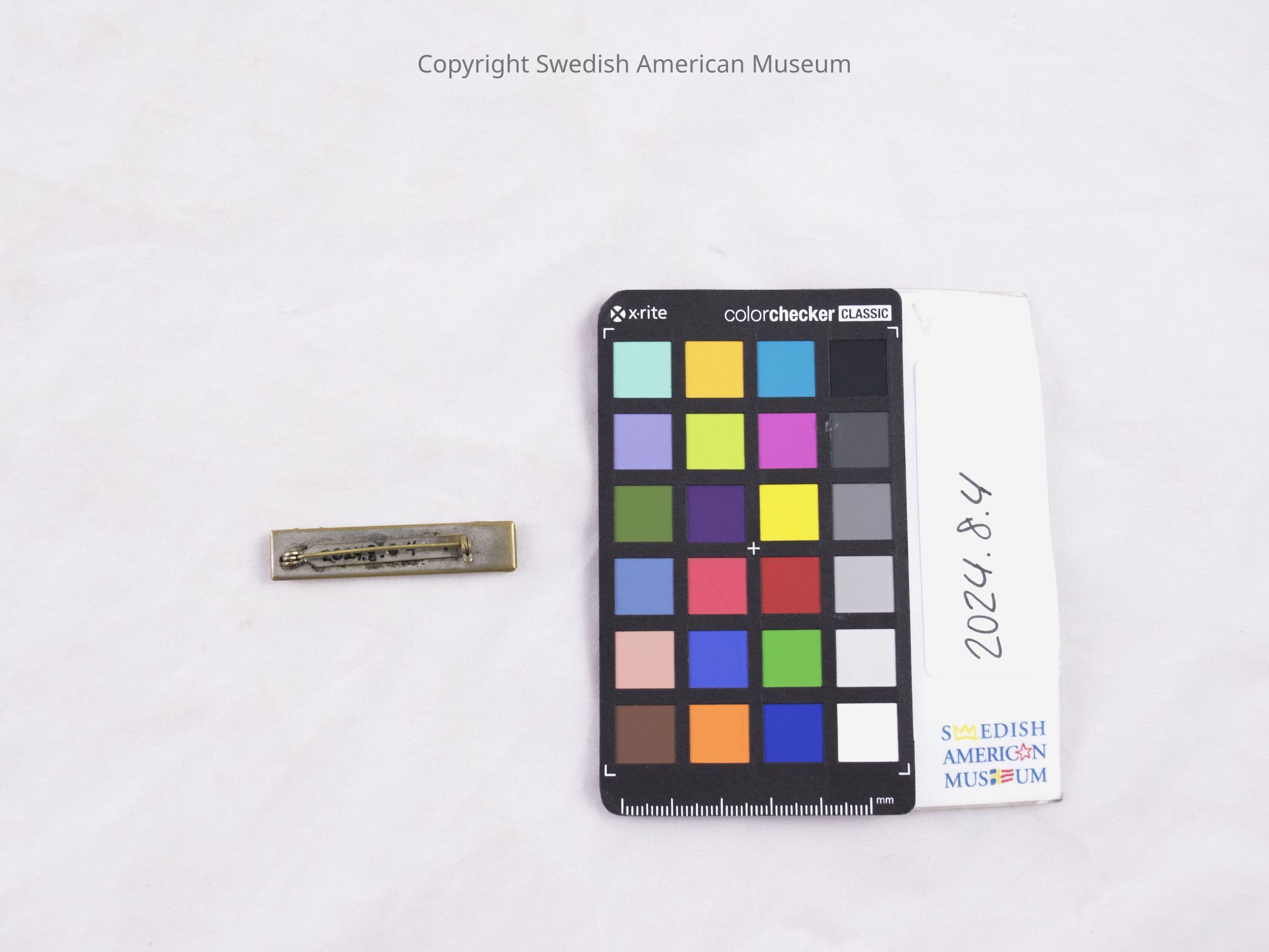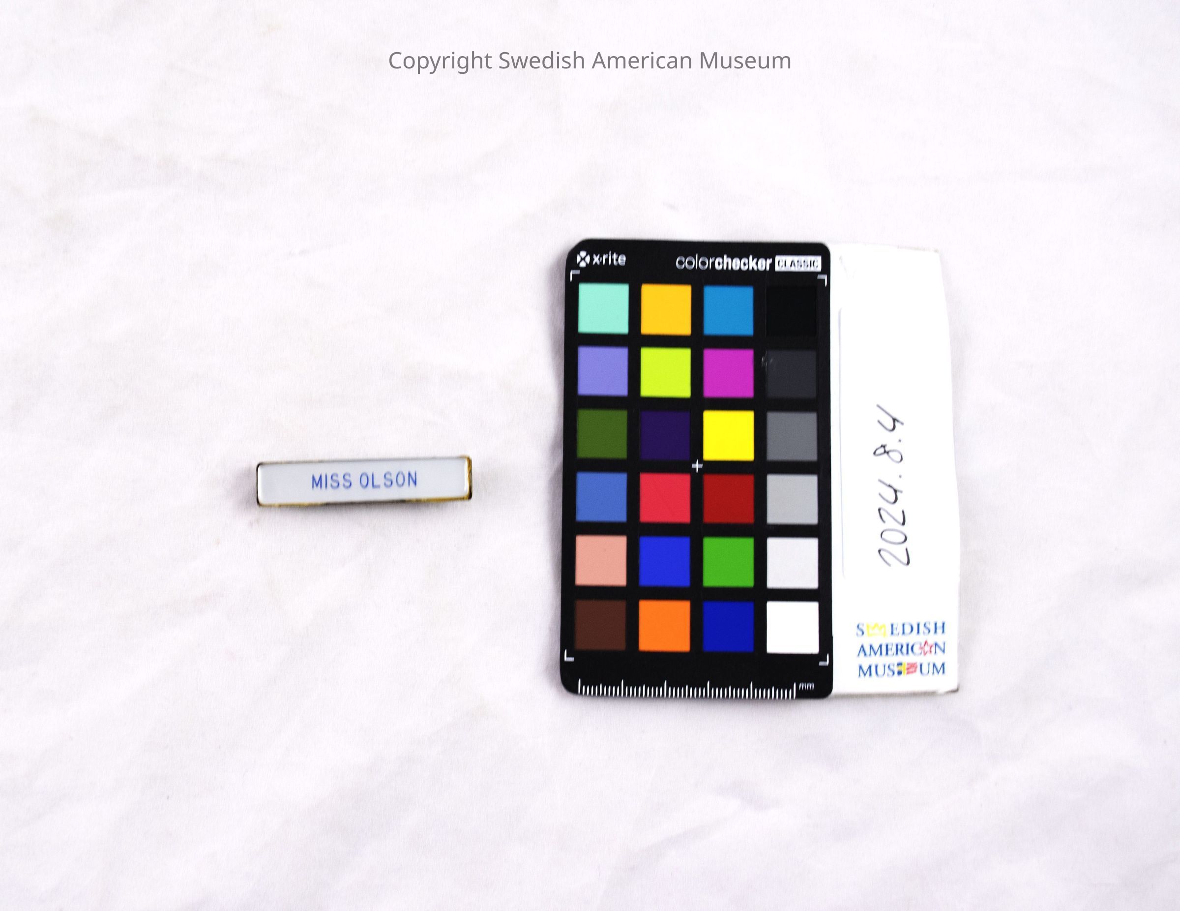Opalescent bar-shaped nametag pin which reads "MISS OLSON" in blue lettering. Back of the pin is made of brassy metal.Use