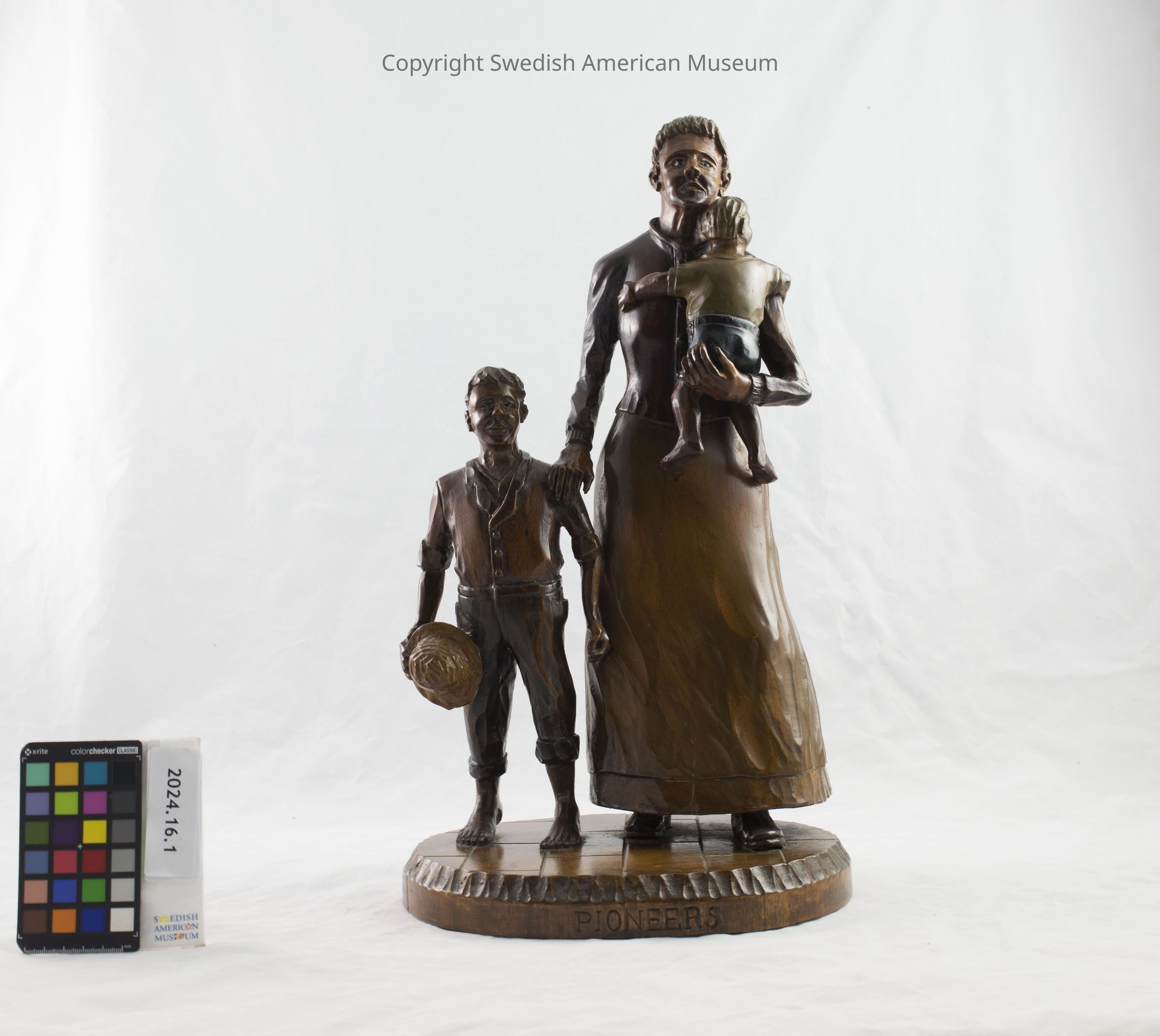 Wooden sculpture by Charles Granstrom, Joliet, IL “Pioneer Mother”, 1957. A mother with two children. The mother is standing and holding a younger child. To her left is an older child holding a hat.Type of Sculpture