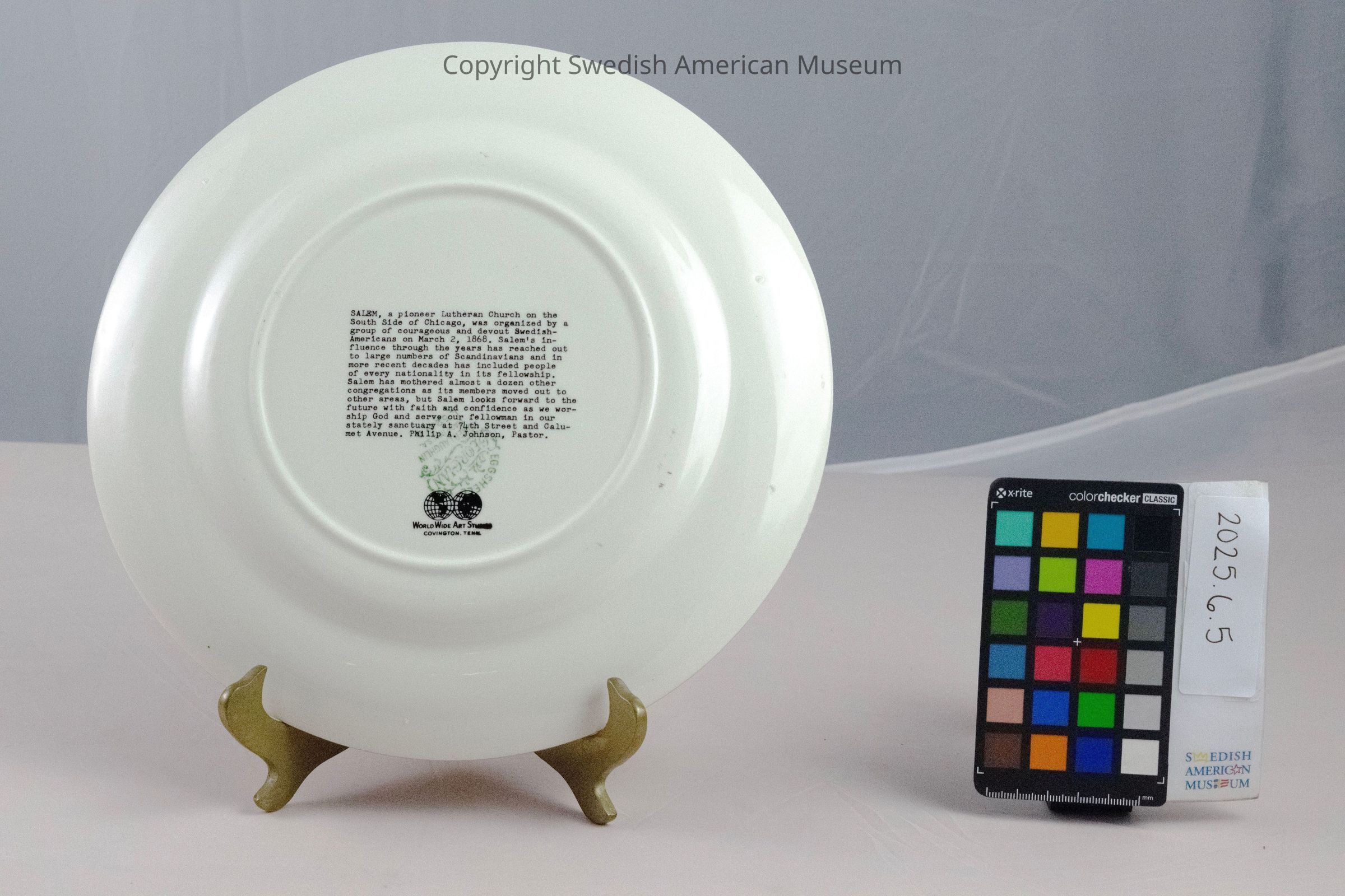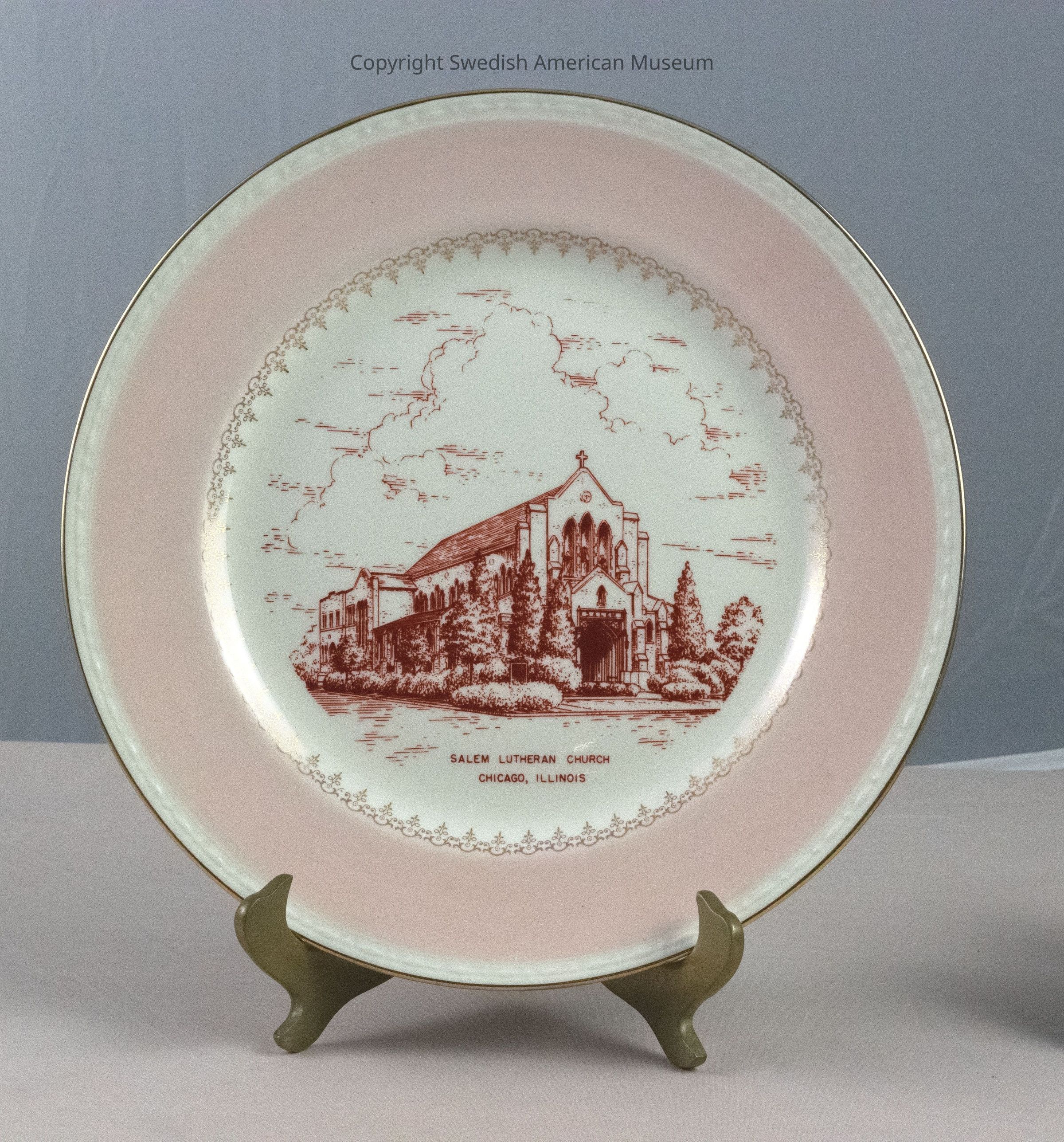 This is a pink and white commemorative porcelain plate with printed design around the inner trim, and an image of the Salem Lutheran Church. Printed below the image is 'Salem Lutheran Church Chicago, Illinois.' On the back of the plate is a description of the founding of the church.Context
