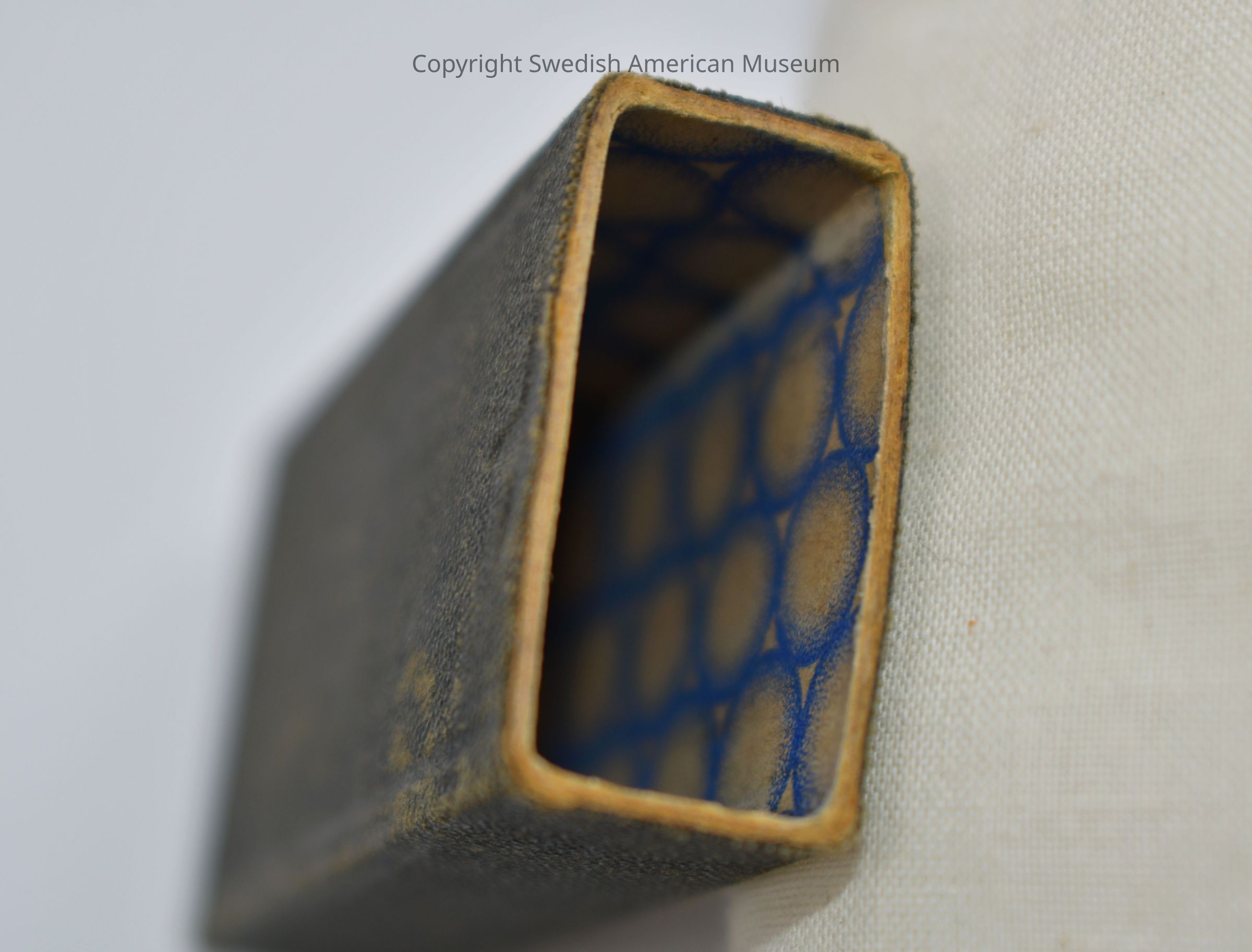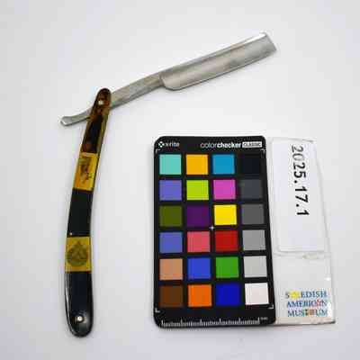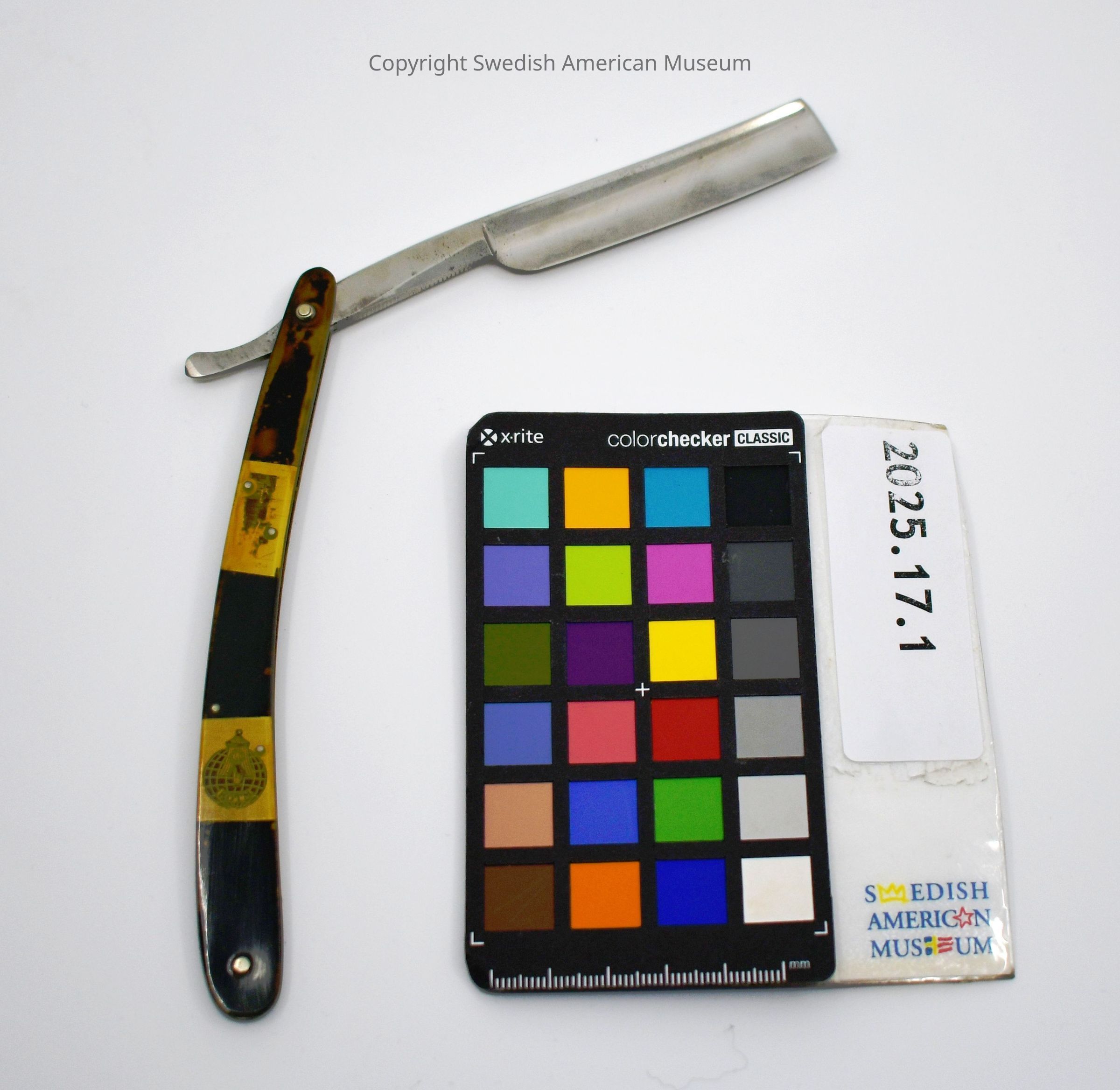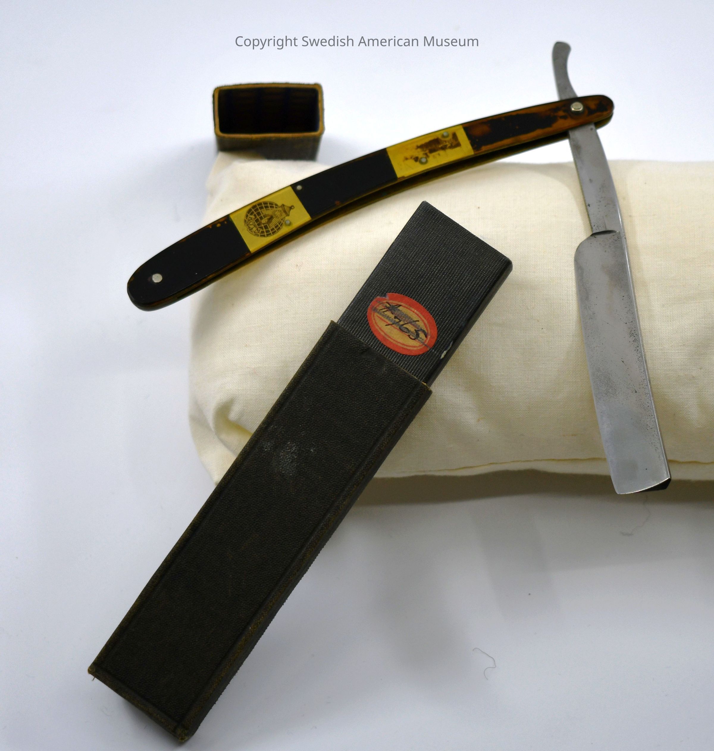 Pocket knife belonging to Charles "Carl" Hedberg. Knife handle is yellow and black with small imagery on the front and back and comes in a black case.