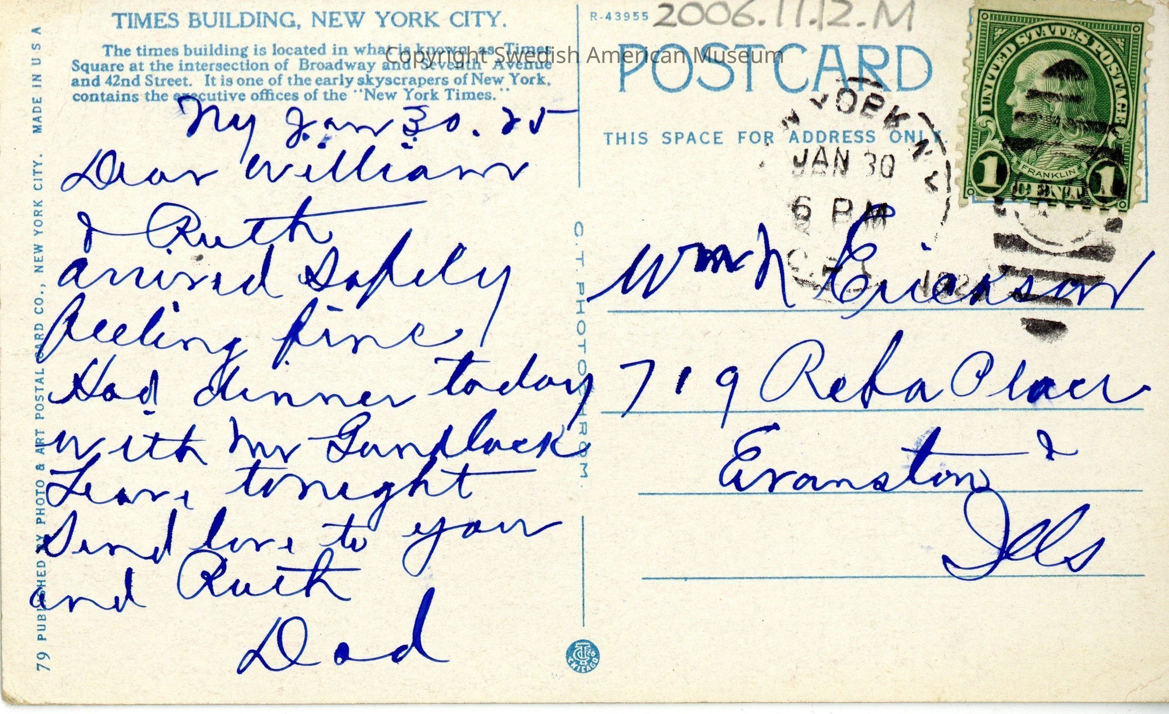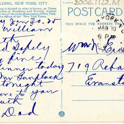 Postcard of New York City, New York addressed to William Erikson.