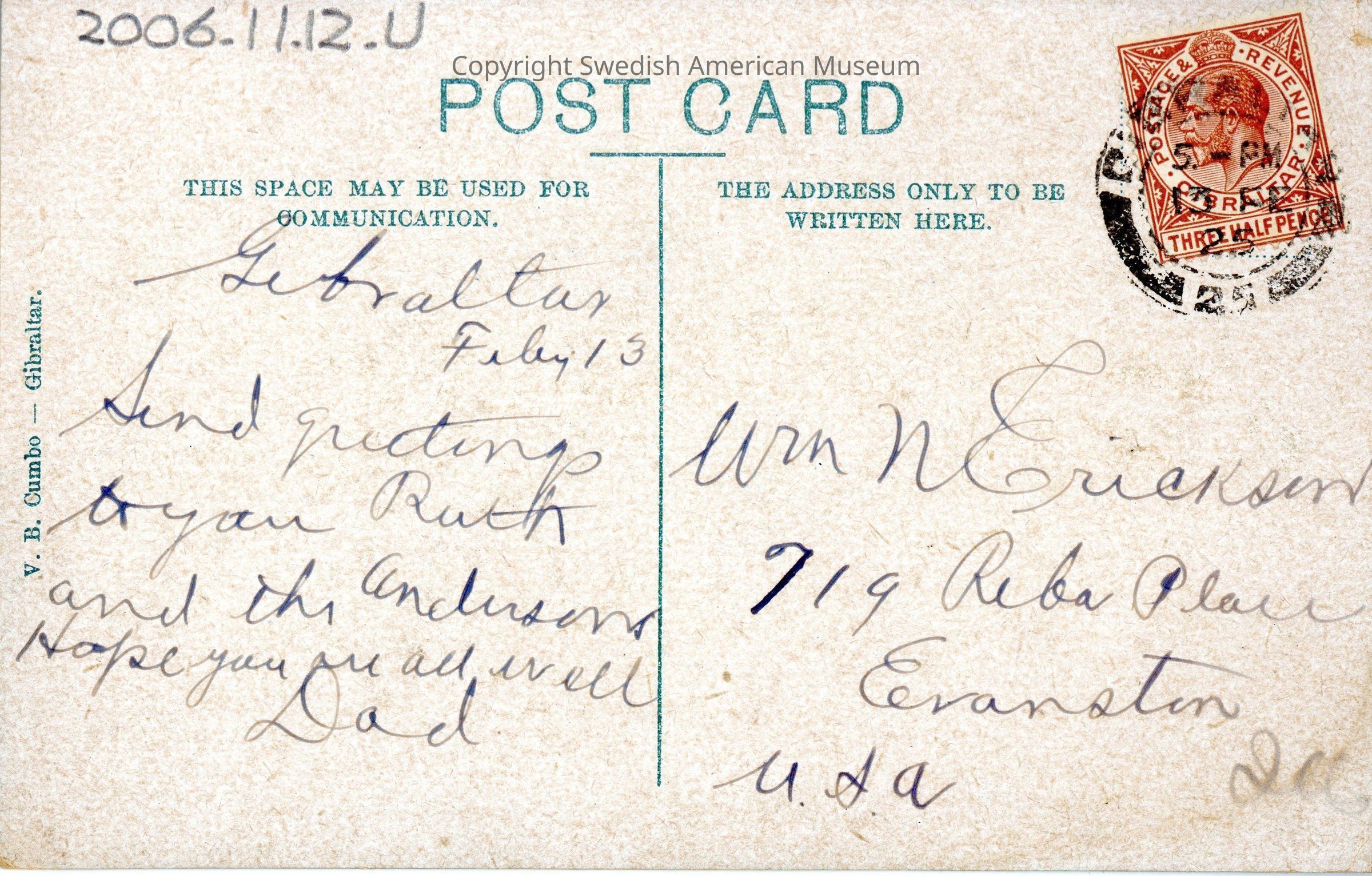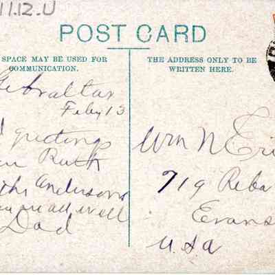 Postcard of Rock from the Bay, Gibraltar addressed to William Erikson.