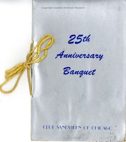 A program and menu for the South Side Swedish Club sponsored 25th Anniversary Banquet at the Club Sandviken of Chicago. It has a gray cover with a yellow string tying the spine together.