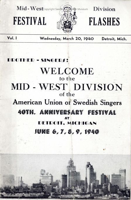 A program for the American Union of Swedish Singers, 40th Anniversary festival as a part of the "Mid-West Division Festival Flashes." The festival took place in Detroit, Michigan; June 6, 7, 8, 9, 1940.Acquisition