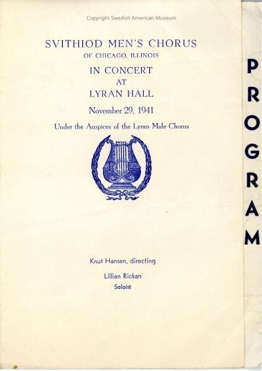 Program for Svithiod's Men's Chorus concert at Lyran Hall, 1941.