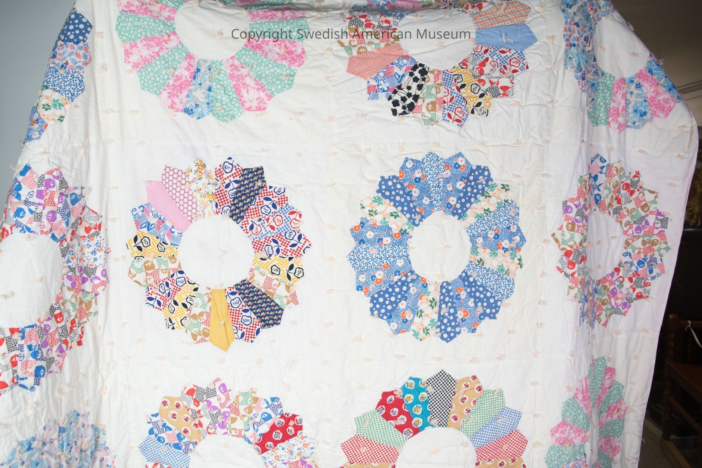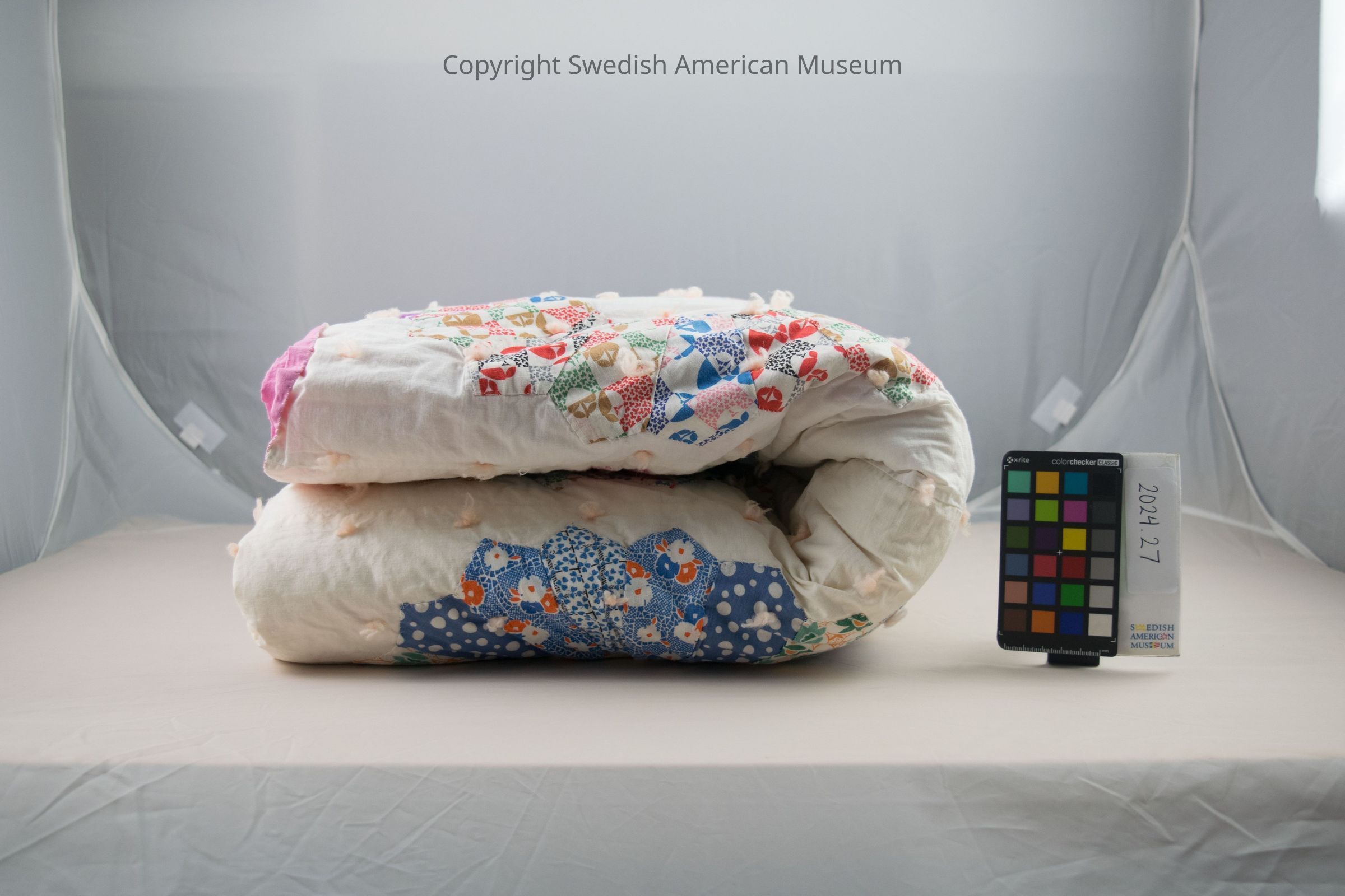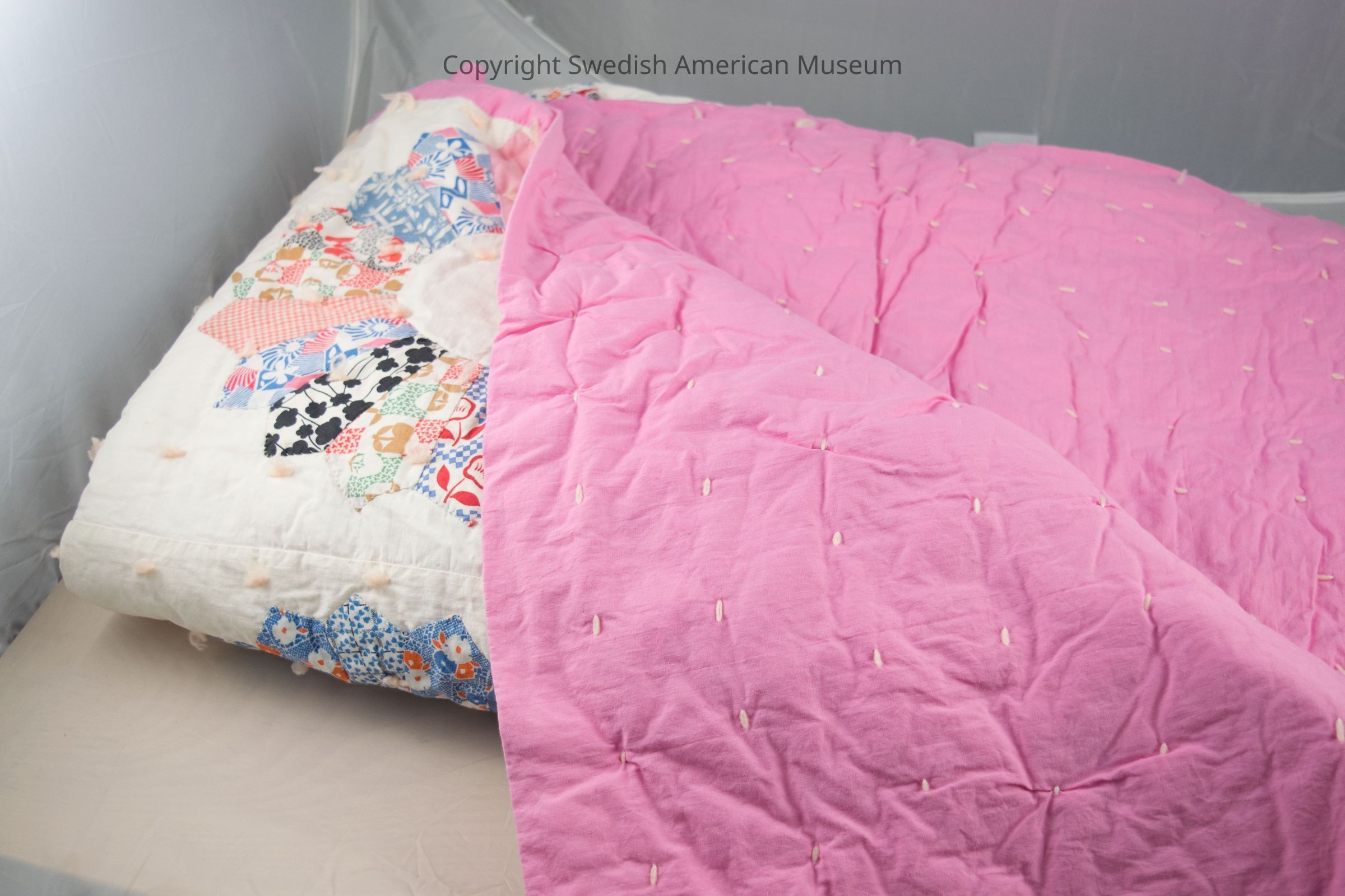 Handmade quilt with flower design and pink backing. Large knots made of thread are spread across the quilt, to keep the back and front in place, and the flowers are made up other patterned fabrics.Textile Type