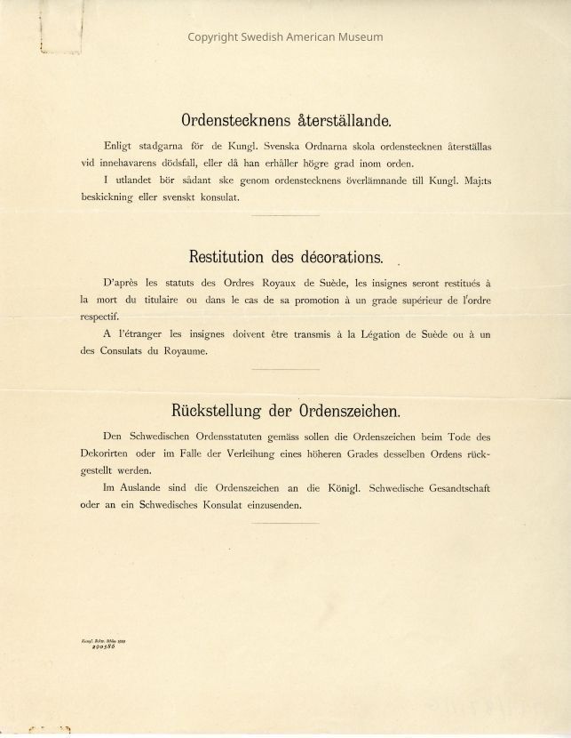 A piece of paper with the printed rules for return and acceptance, Royal Order of Vasa.Acquisition