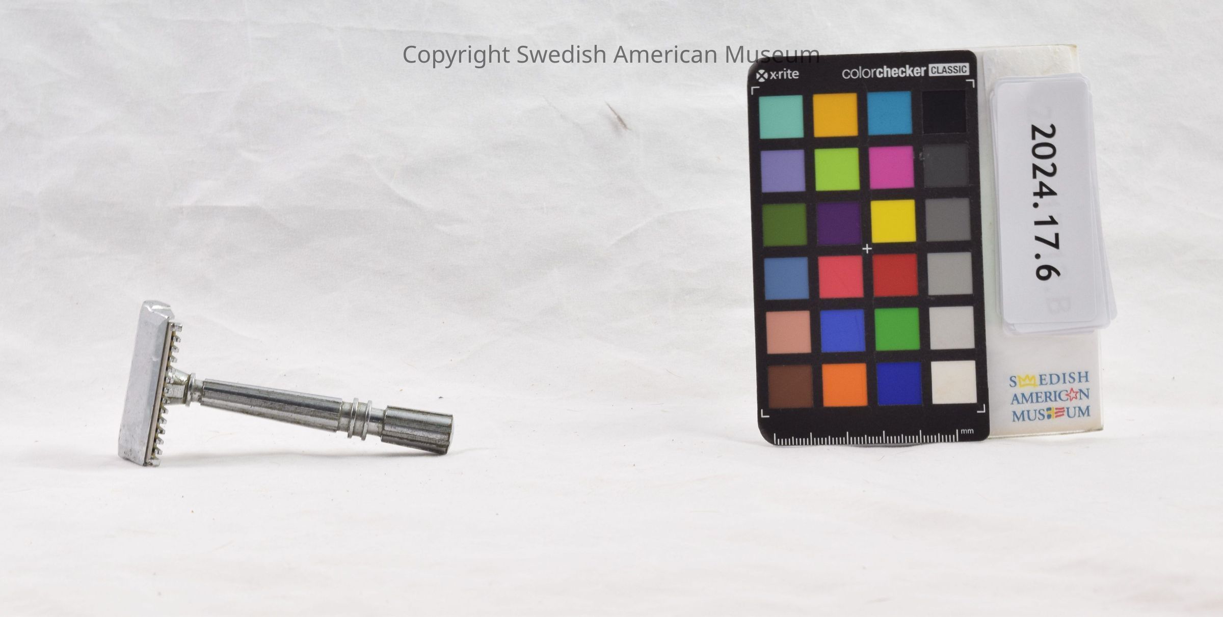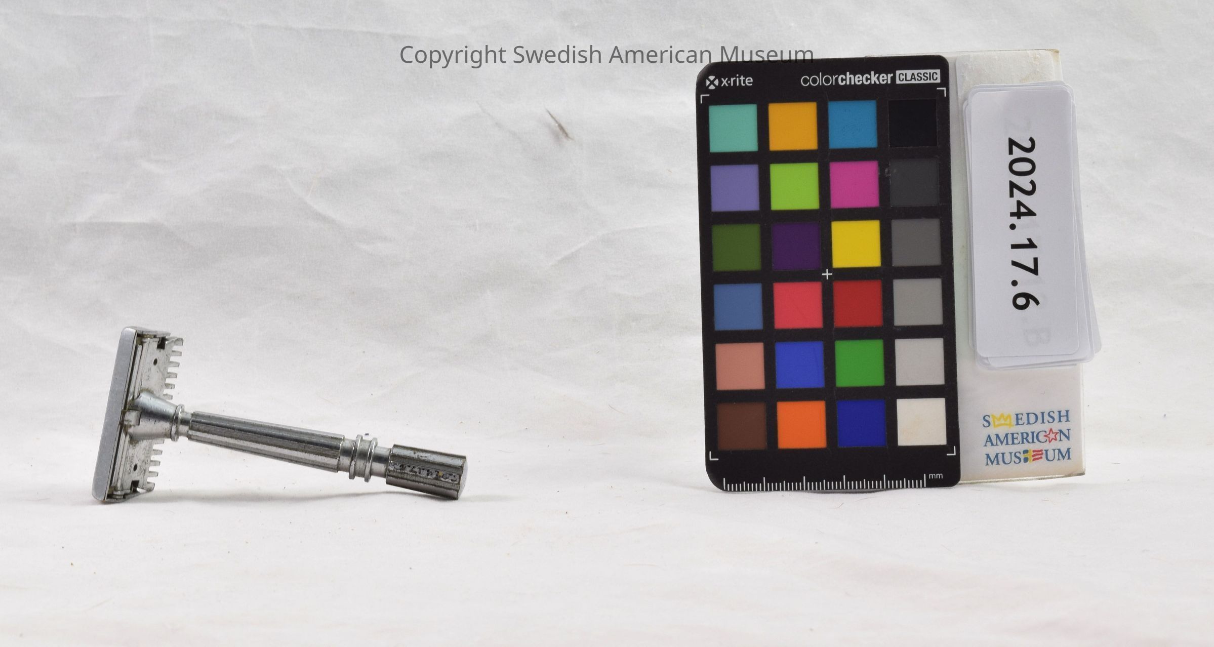 Gem Micromatic-brand single edge open comb safety razor with grooved metal handle. Bottom of handle twists to open razor compartment. Contains a Duridium/Gem-brand razor. Dated to late 1920s/early 1930s.