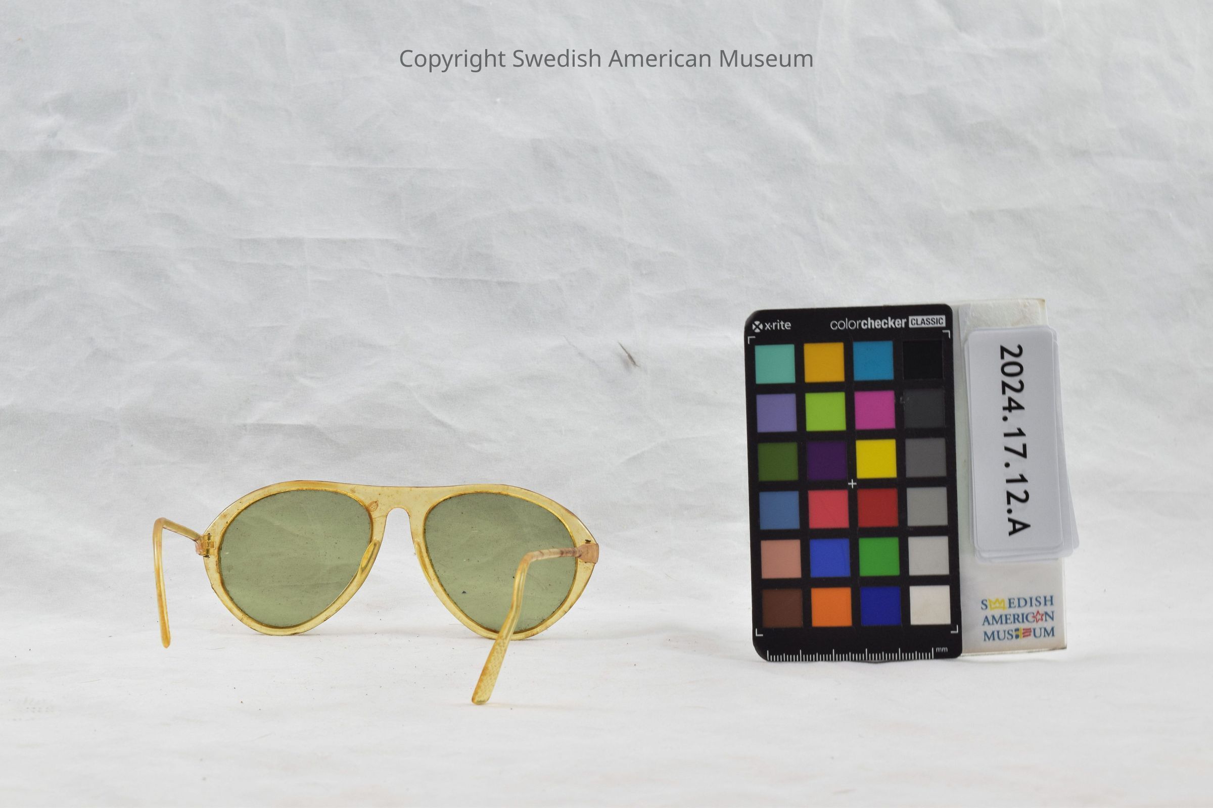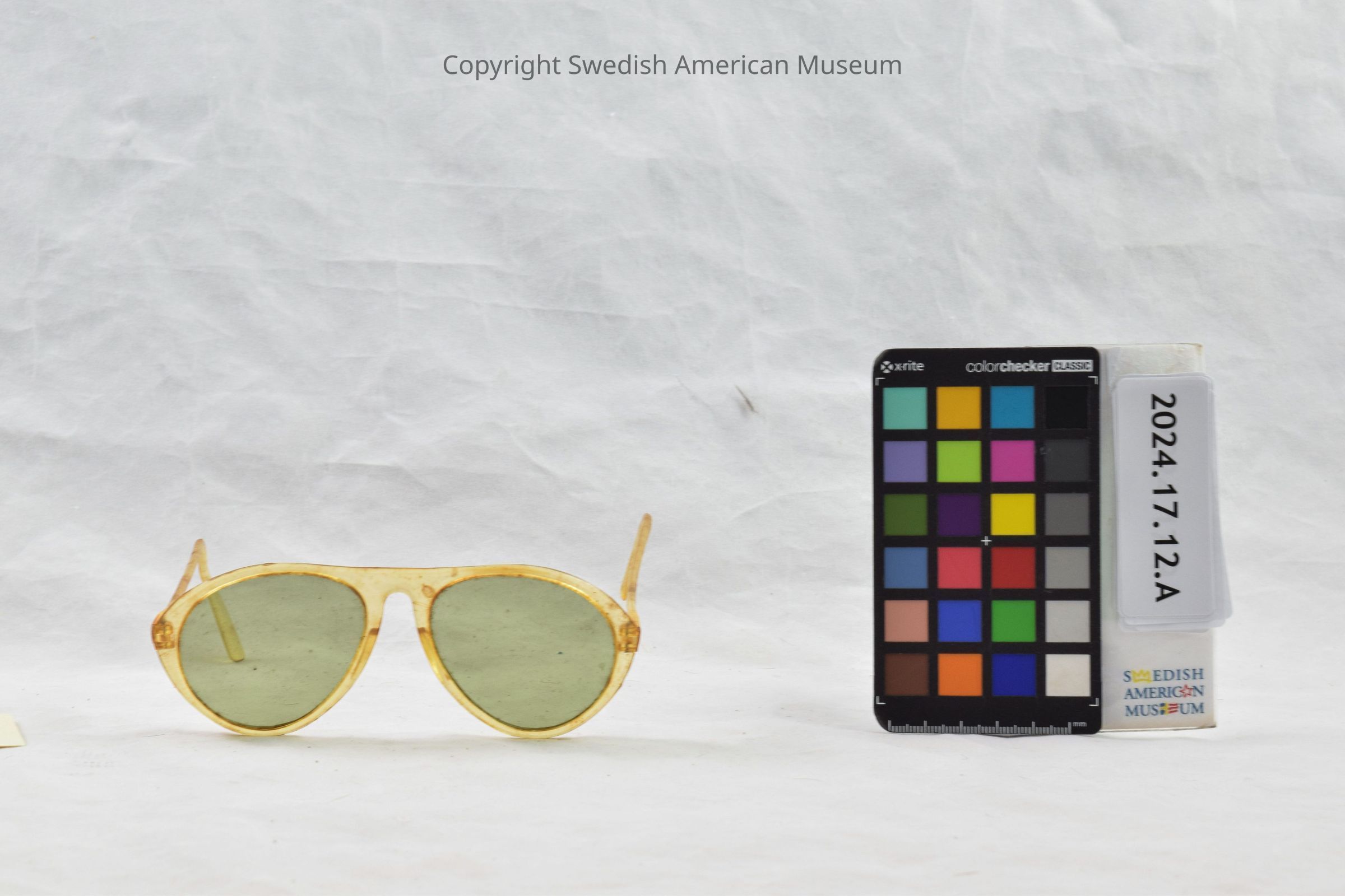 Aviator-style sunglasses with green-tinted lenses and clear yellow acrylic frames.Context
