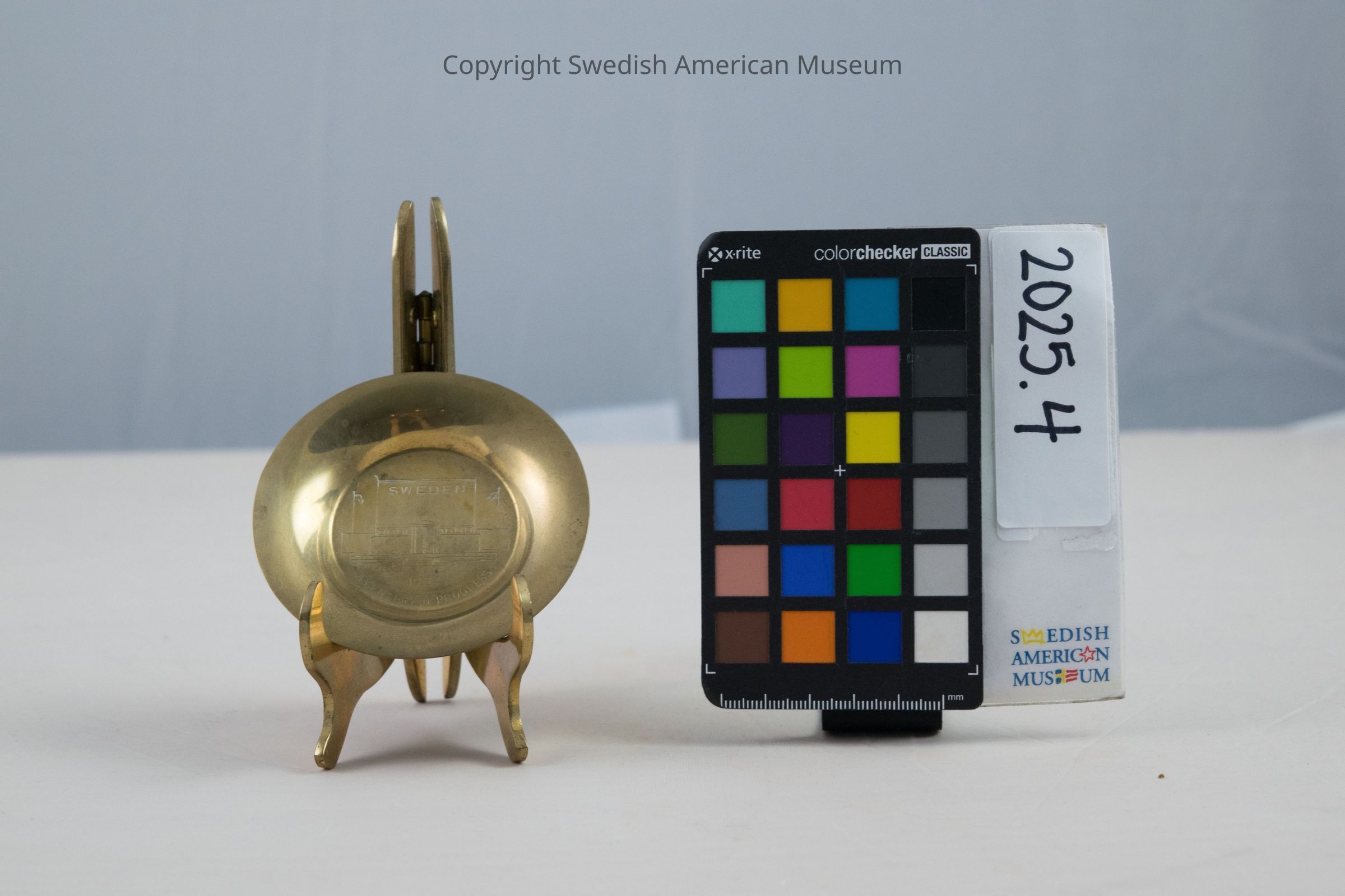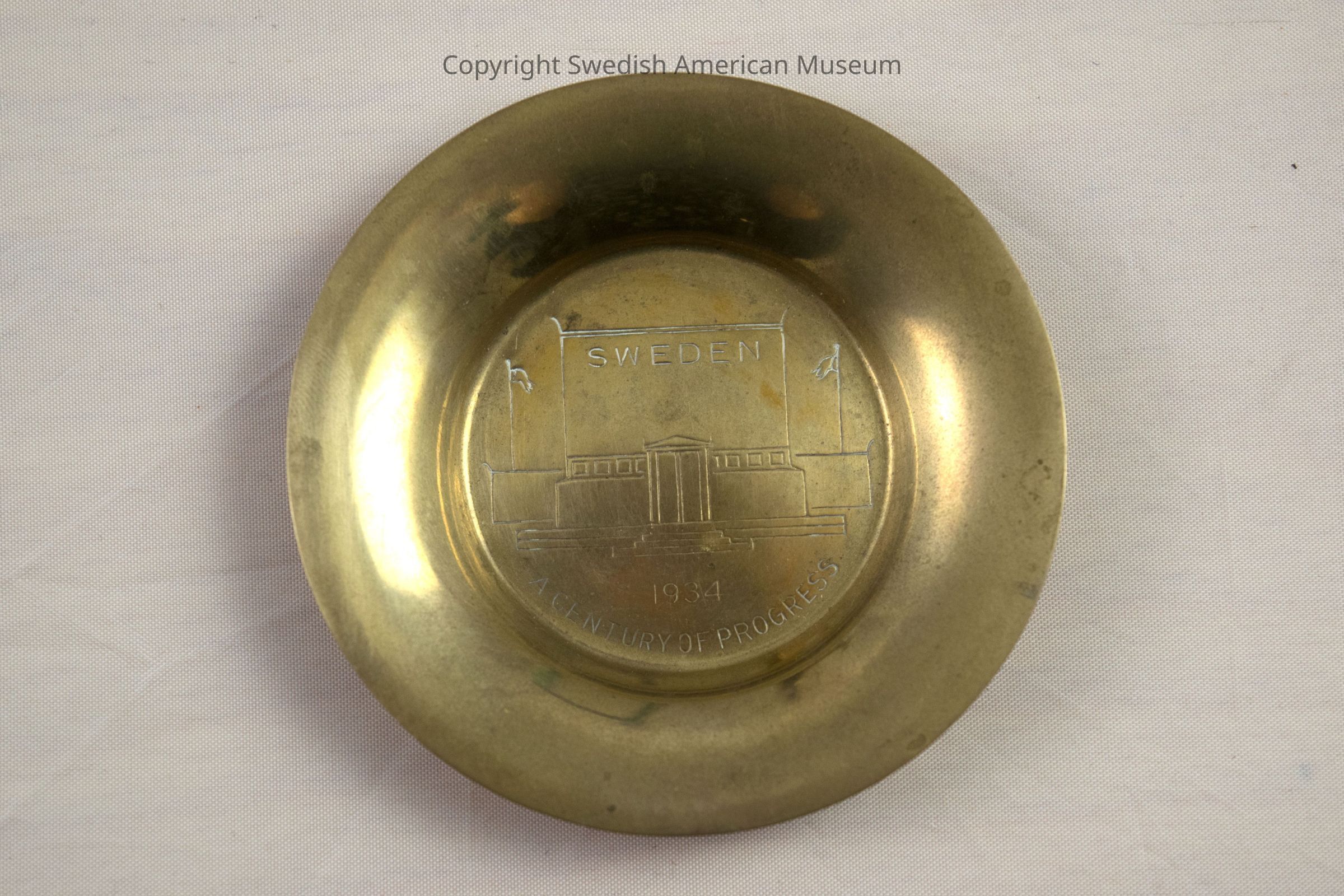 Brass trinket dish from the 1934 Chicago World's Fair, with an engraving of the Swedish Pavilion and the description "1934, A Century of Progress".Context