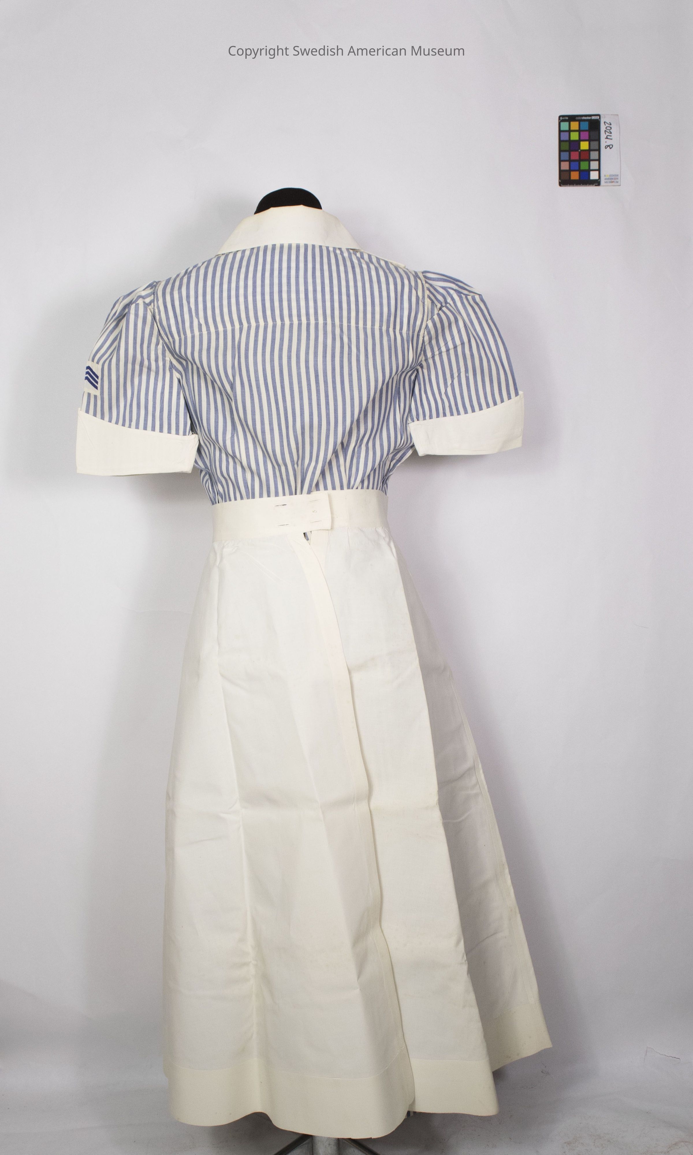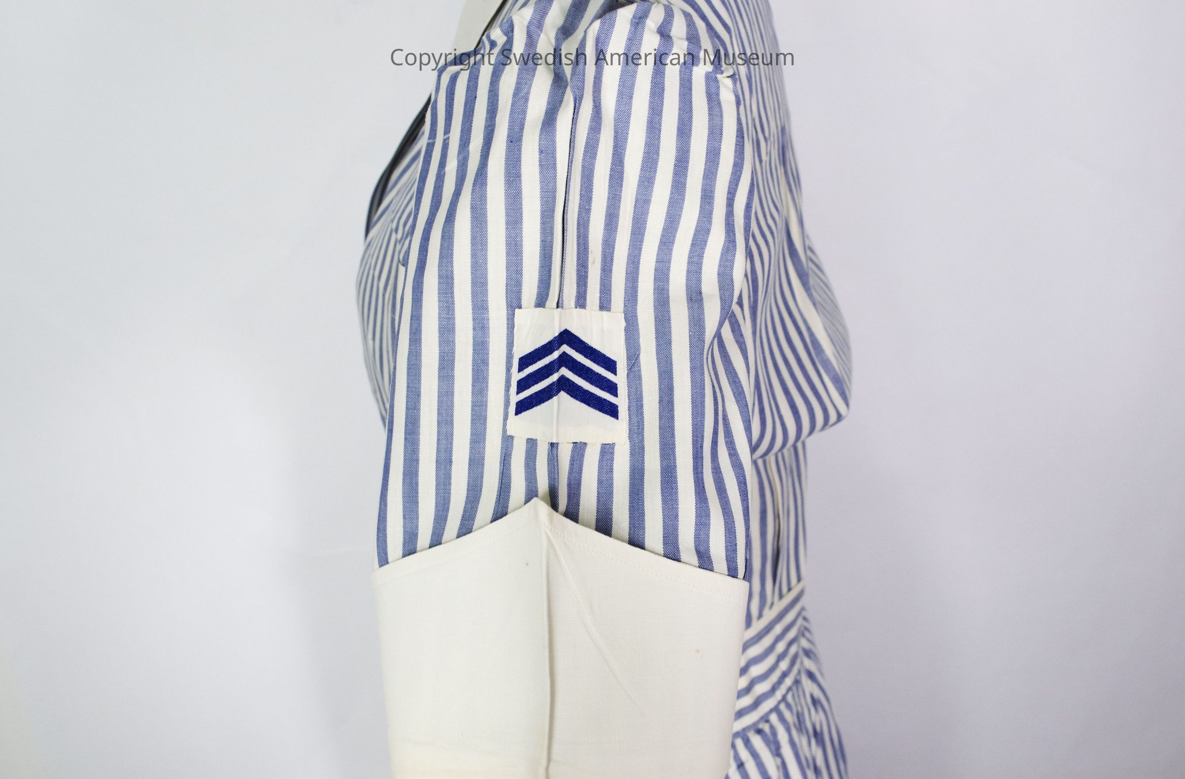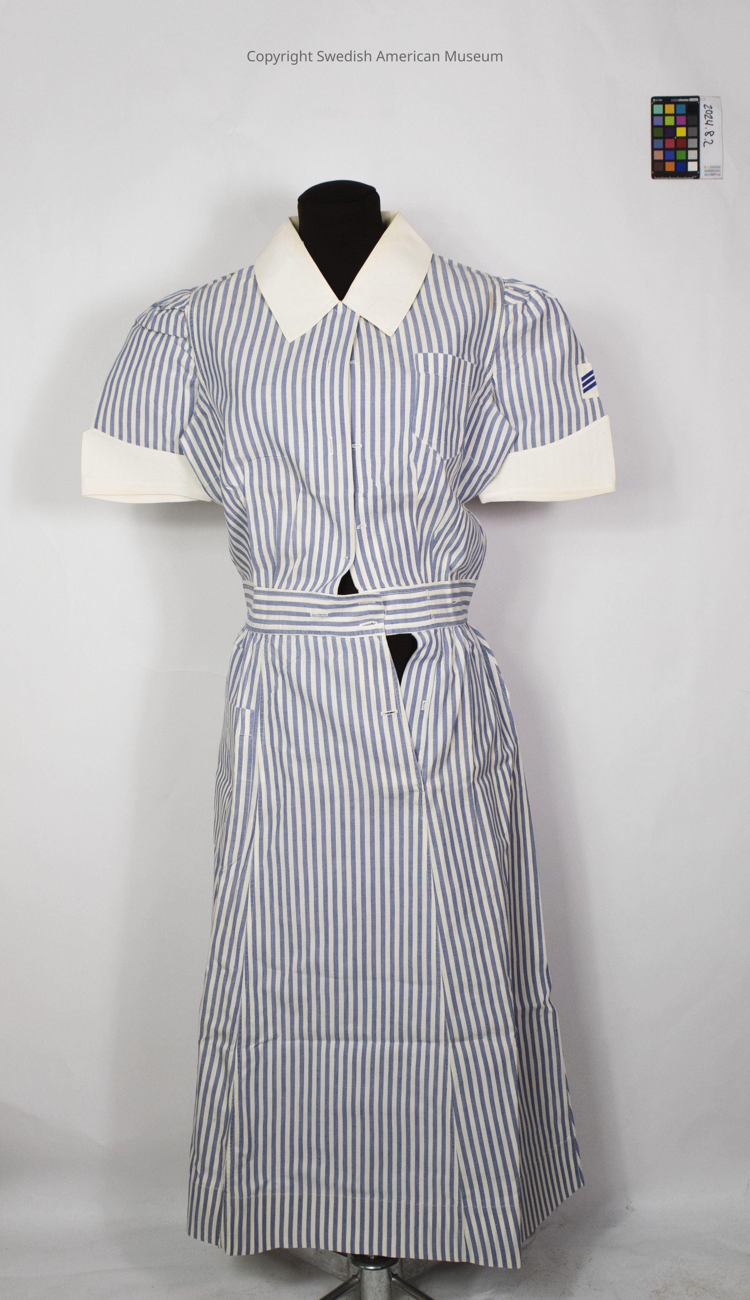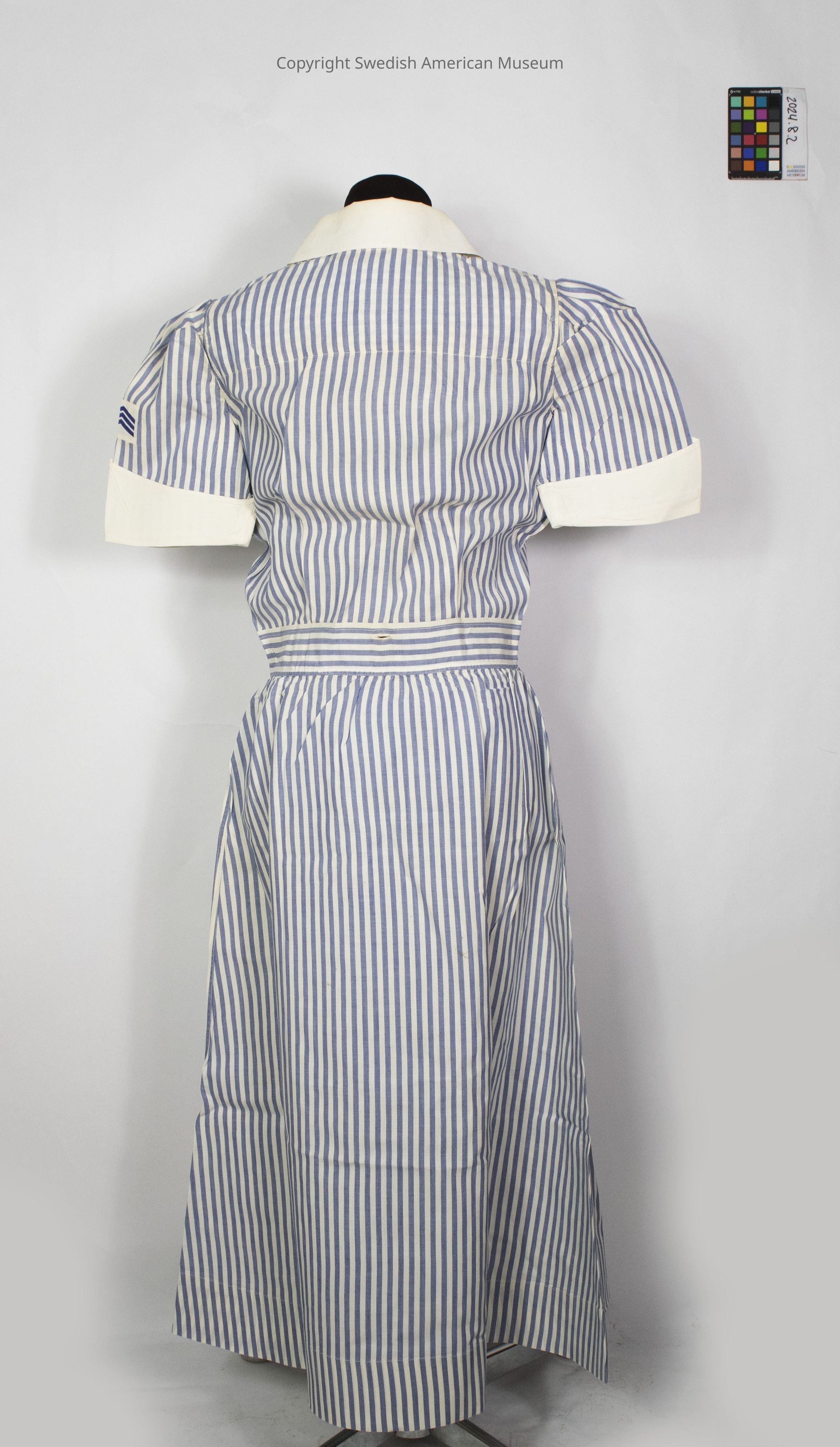 Blue and white pin-striped nursing uniform with starched white collar, short sleeves, and right-hand breast pocket. Buttonholes down the front and at waist. There is a patch on the right arm with three v-shaped blue lines.Use