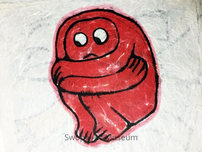 Red Hue Man hugging knees to chest, wide eyes looking down to side (Drawings for Old Mr. World and the Hue Mans animated film)Entry/Object ID